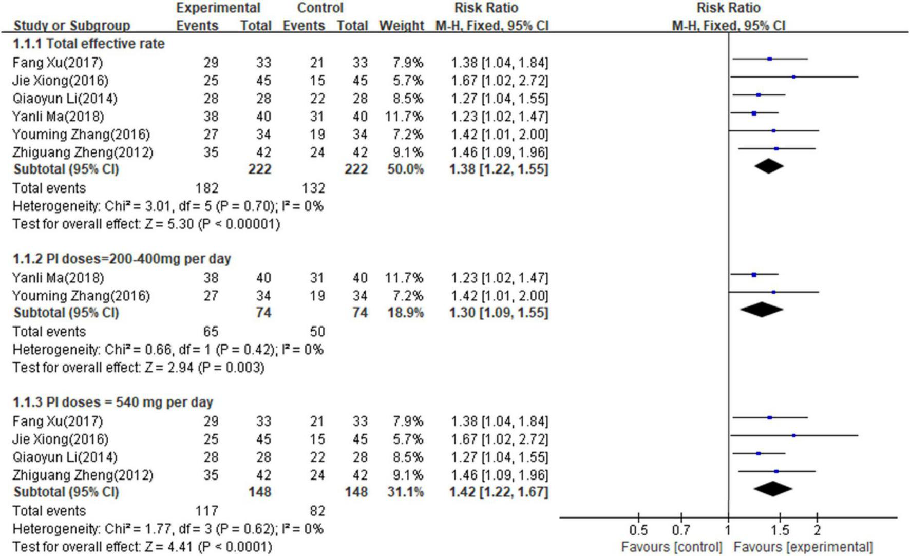 Six studies (14–17, 20, 21) involving 444 patients reported the total effective rate. The fixed-effects model was used for meta-analysis as there existed little heterogeneity between the studies (p = 0.83, I2 = 0%). As shown in Figure 2, the results of the meta-analysis suggested that PI combined with conventional medical treatment increased the total effective rate by comparing with conventional medicine alone (RR = 1.38; 95% CI, 1.22–1.55; p < 0.001), indicating that PI had a favorable adjunctive effect on the total effective rate of AHF. Subgroup analyses according to PI doses showed that 200–400 mg/day (RR = 1.30; 95% CI, 1.09–1.55; p = 0.003) and 500 mg/day (RR = 1.42; 95% CI, 1.22–1.67; p < 0.001) of PI combined with conventional medicines treatments both increased the total effective rate compared with conventional medicine alone.
