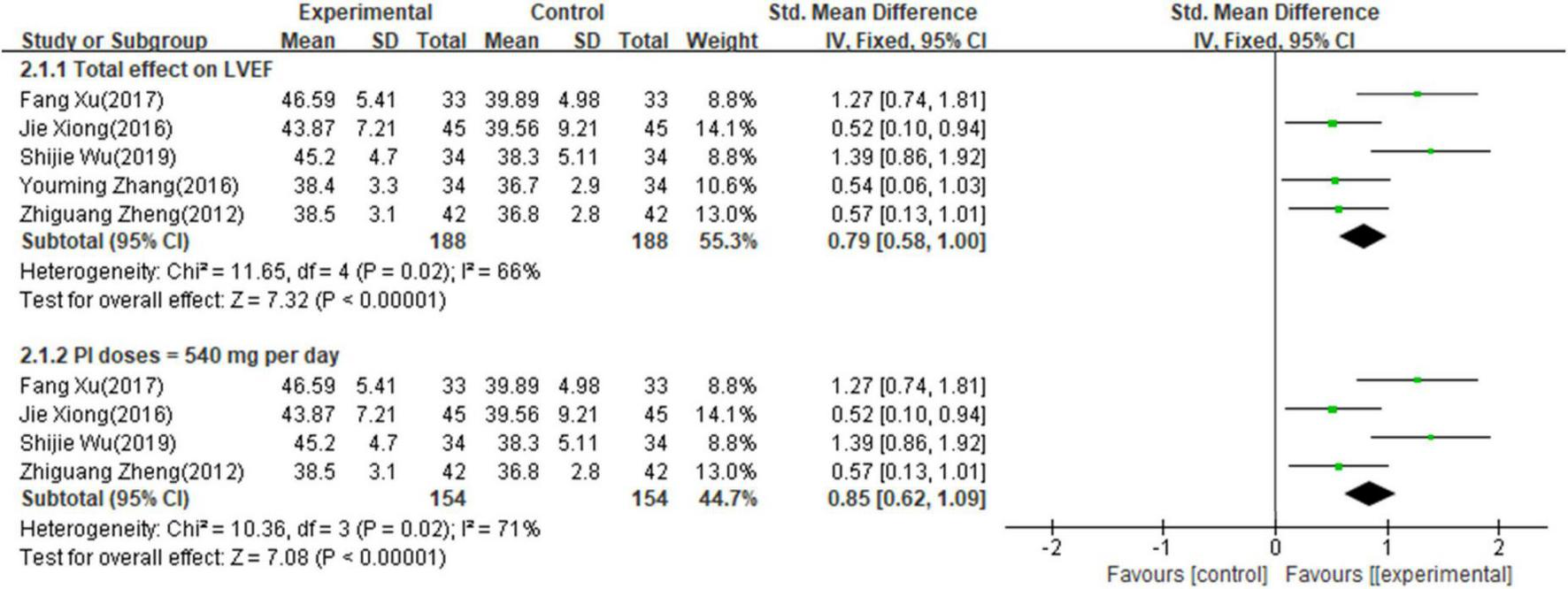 Seven studies involving 534 patients reported the results of LVEF. The random-effects model was used for meta-analysis as there existed high heterogeneity between studies (p < 0.001, I2 = 96%). The results of the meta-analysis indicated that combining PI with a conventional medical treatment significantly improved LVEF (RR = 1.07; 95% CI, 0.87–1.27; p < 0.001, Supplementary Figure 1). Sensitivity analyses were performed by excluding studies one by one. After removing the studies reported by “(17)” (17) and “(18)” (18), heterogeneity between studies was significantly reduced to 66%. As shown in Table 1, the sample size of the study “(17)” (17) and “(18)” (18) were the largest and smallest compared with other studies respectively, which might contribute to high heterogeneity. The results showed that the LVEF of patients with AHF was still significantly improved by the combined use of PI with conventional medical treatment (SMD = 0.79; 95% CI, 0.58–1.00; p < 0.001, Figure 3), and it indicated that combined use of PI was beneficial for LVEF in patients with AHF. Subgroup analyses showed that 500 mg/day of PI combined with conventional medicines treatments also improved the LVEF compared with conventional medicine alone (SMD = 0.85; 95% CI, 0.62–1.09; p < 0.001, Figure 3). As “(15)” (15) did not report the LVEF valve, there were no sufficient studies (≥2) for subgroup analyses on the dose of 200–400 mg/day.