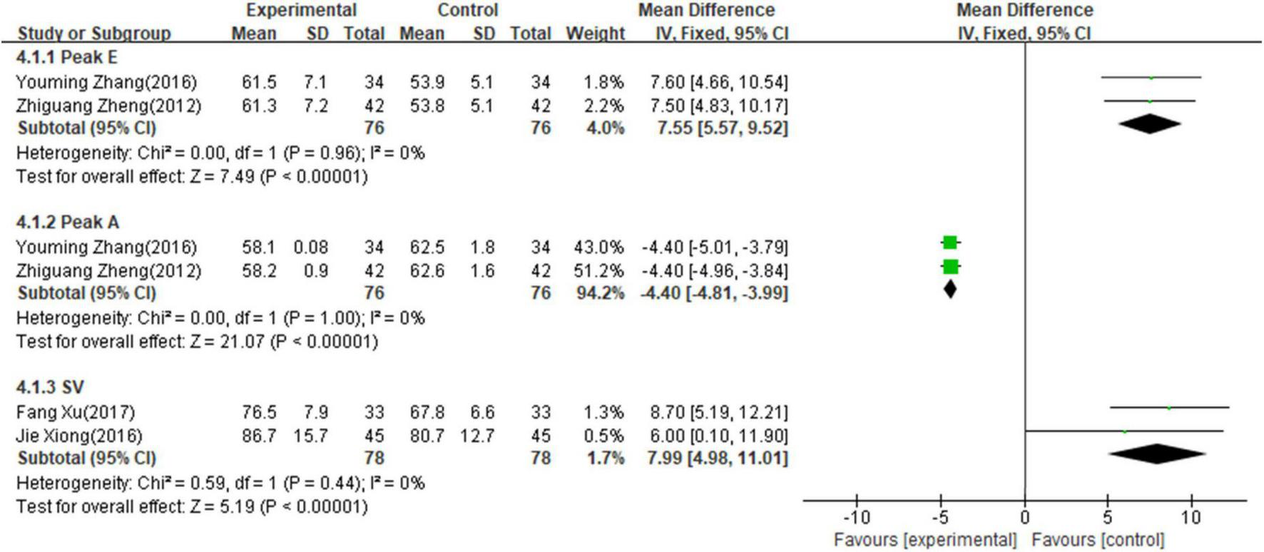 Two studies (16, 20) involving 152 patients reported the value of peak E, two studies (16, 20) involving 152 patients reported the value of peak A, and two studies (14, 21) involving 156 patients reported the value of SV. The fixed-effects model was used for meta-analysis on peak E (p = 0.96, I2 = 0%), Peak A (p = 1.00, I2 = 0%) and IVRT (p = 0.44, I2 = 0%) as there existed no heterogeneity between studies. As shown in Figure 5, the results of meta-analysis indicated that combining PI with conventional medicine treatment improved the left ventricular diastolic function, including increased peak E (MD = 7.55; 95% CI, 5.57–9.52; p < 0.001, Figure 5), decreased Peak A (MD = −4.40; 95% CI, −4.81 to −3.99; p < 0.001, Figure 5), and increased SV (MD = 7.99; 95% CI, 4.98–11.01; p < 0.001, Figure 5) when compared with conventional medicine alone.