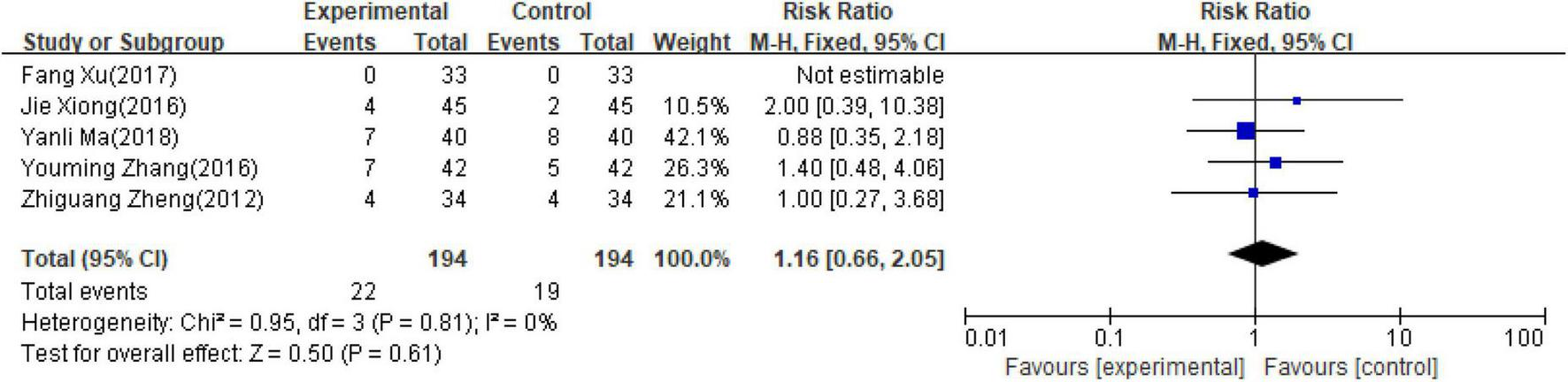 Five studies (14–16, 20, 21) involving 388 patients reported adverse events. As detailed in Table 3, one study (14) reported no adverse reactions in both groups and one study (20) reported the total number of adverse effects without classification. Three studies (15, 16, 21) reported a detailed number of each kind of adverse reactions in both groups. In all, it reported a total of 11.9% (23/194) adverse reactions in the PI group and 9.8% (19/194) adverse reactions in the control group. All of the adverse reactions were modest, and no significant difference in the incident rate of adverse events was observed in both groups (RR = 1.16; 95% CI, 0.66–2.05; p = 0.061, Figure 6), indicating that adjunctive use of PI was safe as a conventional medical treatment.
