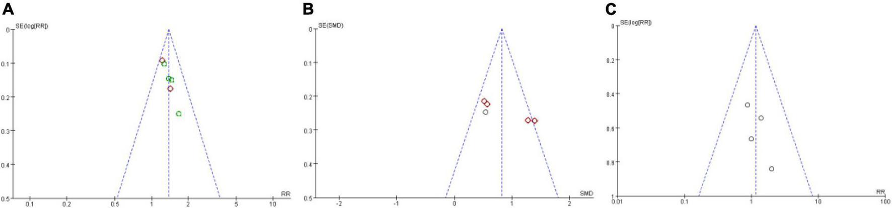 We assessed publication bias on the results of total effective rate, LVEF, and adverse effect, as other results had less than three studies included. We detected that there is no publication bias on the results of total effective rate, LVEF, and adverse effect (Figure 7). But because of lacking access to the information on the clinical trial registry or study protocol, it could not rule out the potential of selectively reporting existing results. The published bias result of other results are provided in Supplementary File 2.