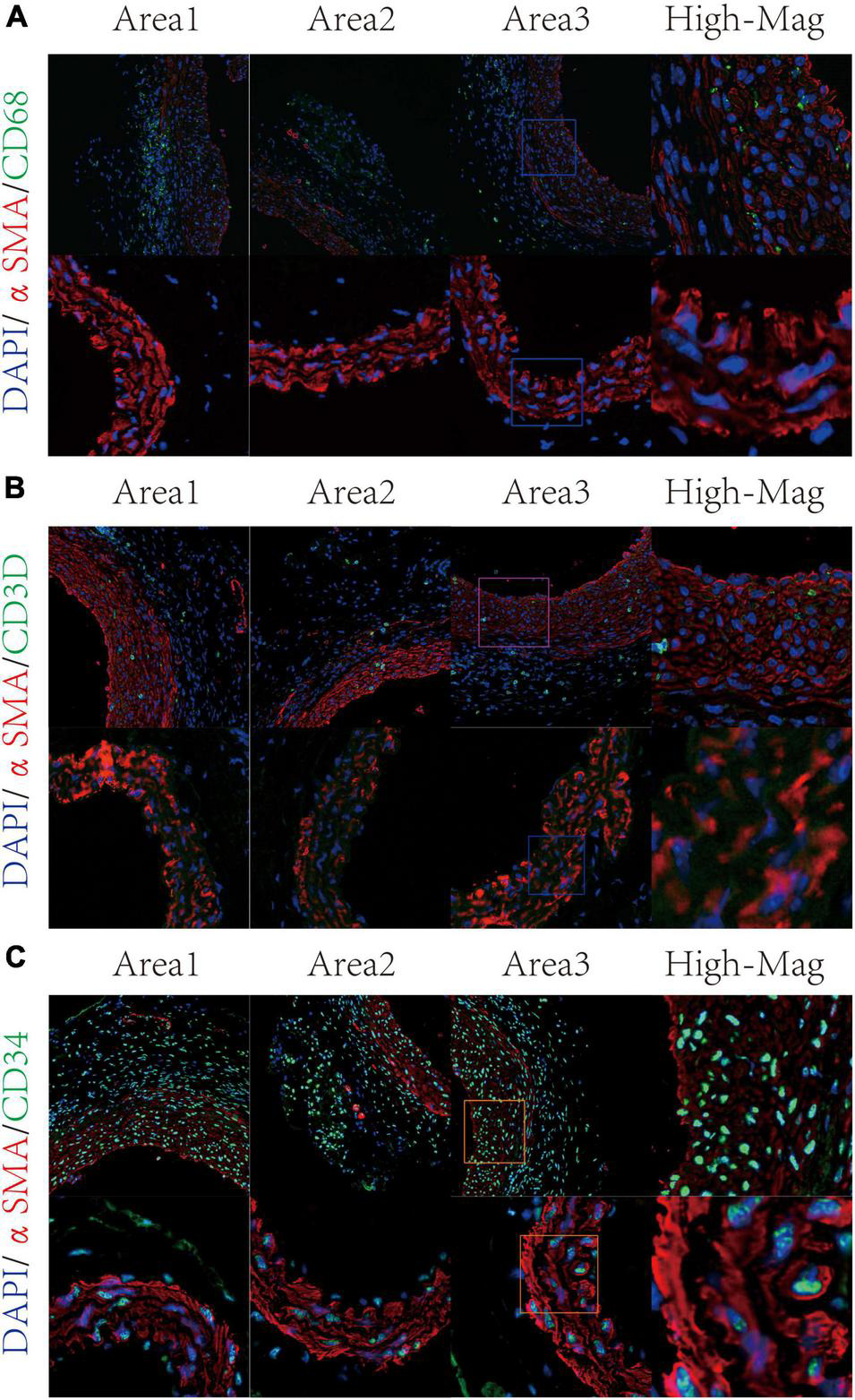 Validation of VSMC subtypes through immunofluorescence staining. Macrophage-like VSMC was labeled by αSMA and CD68 (A). T-cell-like VSMC was labeled by αSMA and CD3D (B); mesenchymal-like VSMC was labeled by αSMA and CD34 (C).