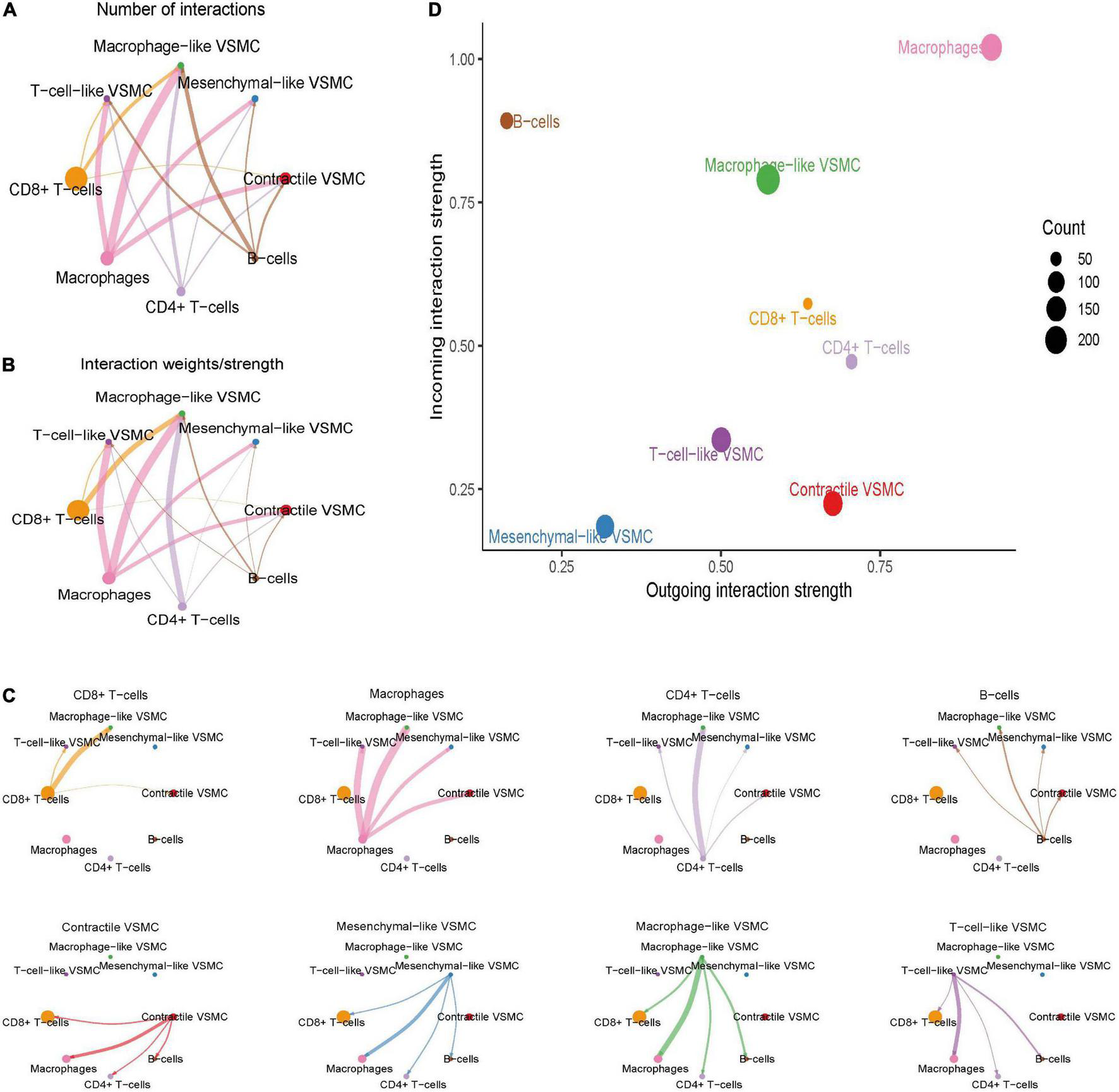 Global cell–cell communication between immune cells and selected VSMC phenotypes. The overall intercellular interaction number (A) and weight (B) were visualized in the network. The line width represents the intensity. Subsequently, the communication intensity from each immune cell type to all VSMC phenotypes or from each VSMC phenotype to all immune cell types was visualized, respectively (C). The incoming and outgoing communication capacity of each cell type (D).