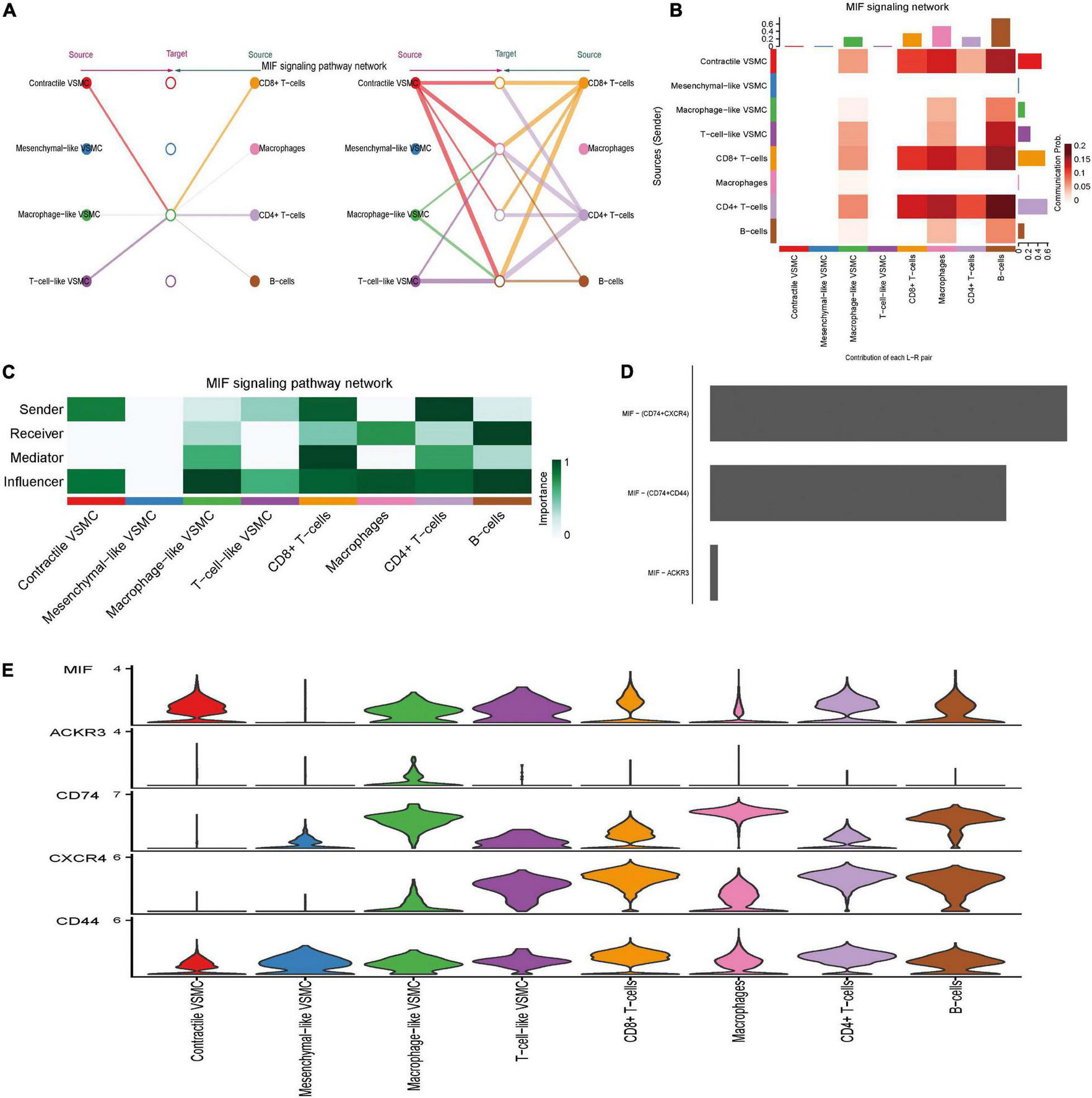 MIF signaling pathway-mediated intercellular communication intensity is shown in the hierarchy plot (A) and heatmap (B). Network center score showed the role each cell type played, including sender, receiver, mediator, and influencer (C). Contribution of each ligand–receptor pair to MIF signaling (D). Expression level of every ligand and receptor gene in each cell type (E).