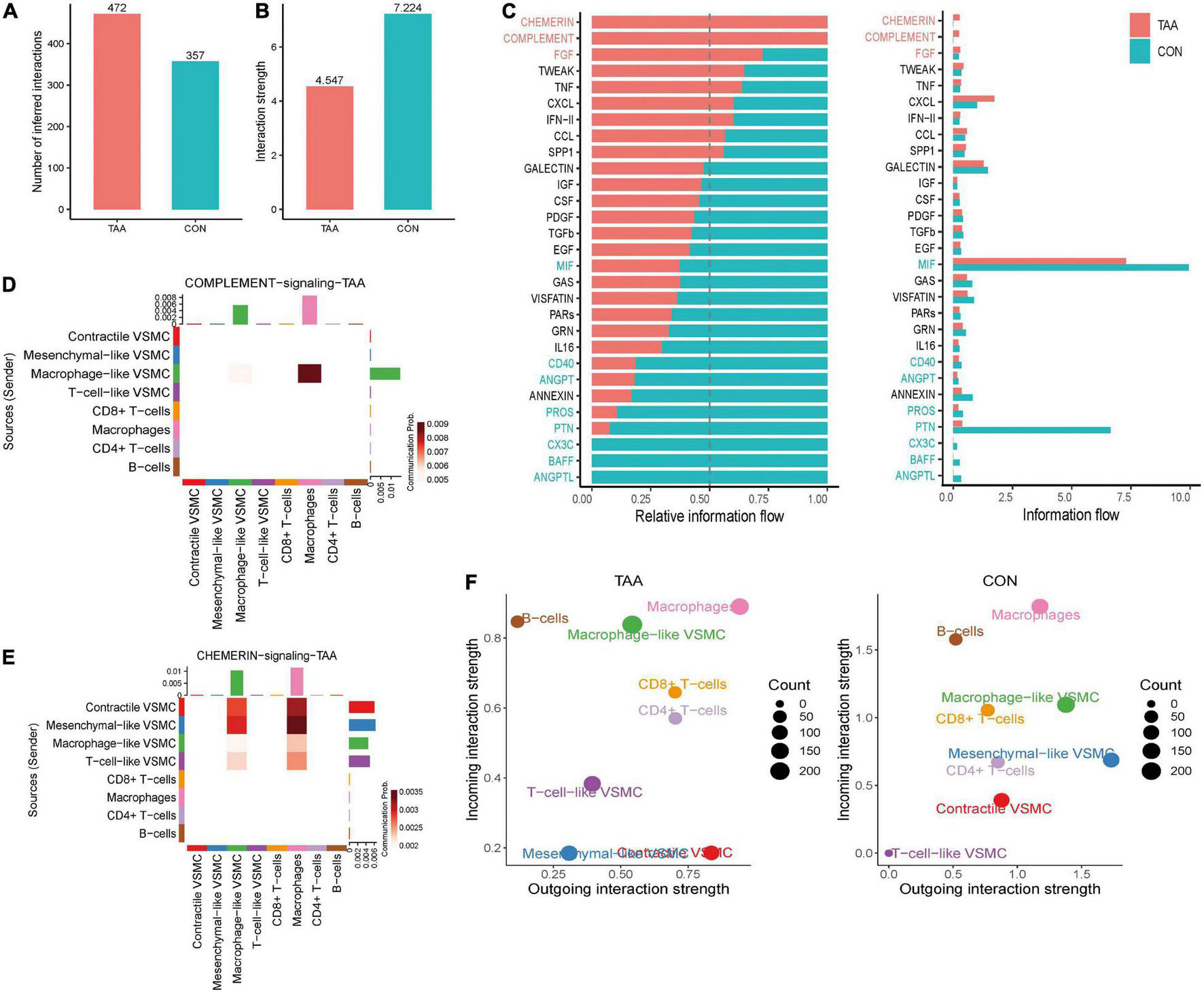 Alterations of intercellular communication patterns between the aortic aneurysm and normal aorta. The number of interactions increased (A), but the mean interaction strength decreased in aortic aneurysms (B). Relative information flow of the significant signaling pathway in the normal aorta and aortic aneurysm (C). Sources and targets of signaling complement (D) and chemerin (E). Alteration of incoming/outgoing communication ability of each cell type between the aortic aneurysm and normal aorta (F).