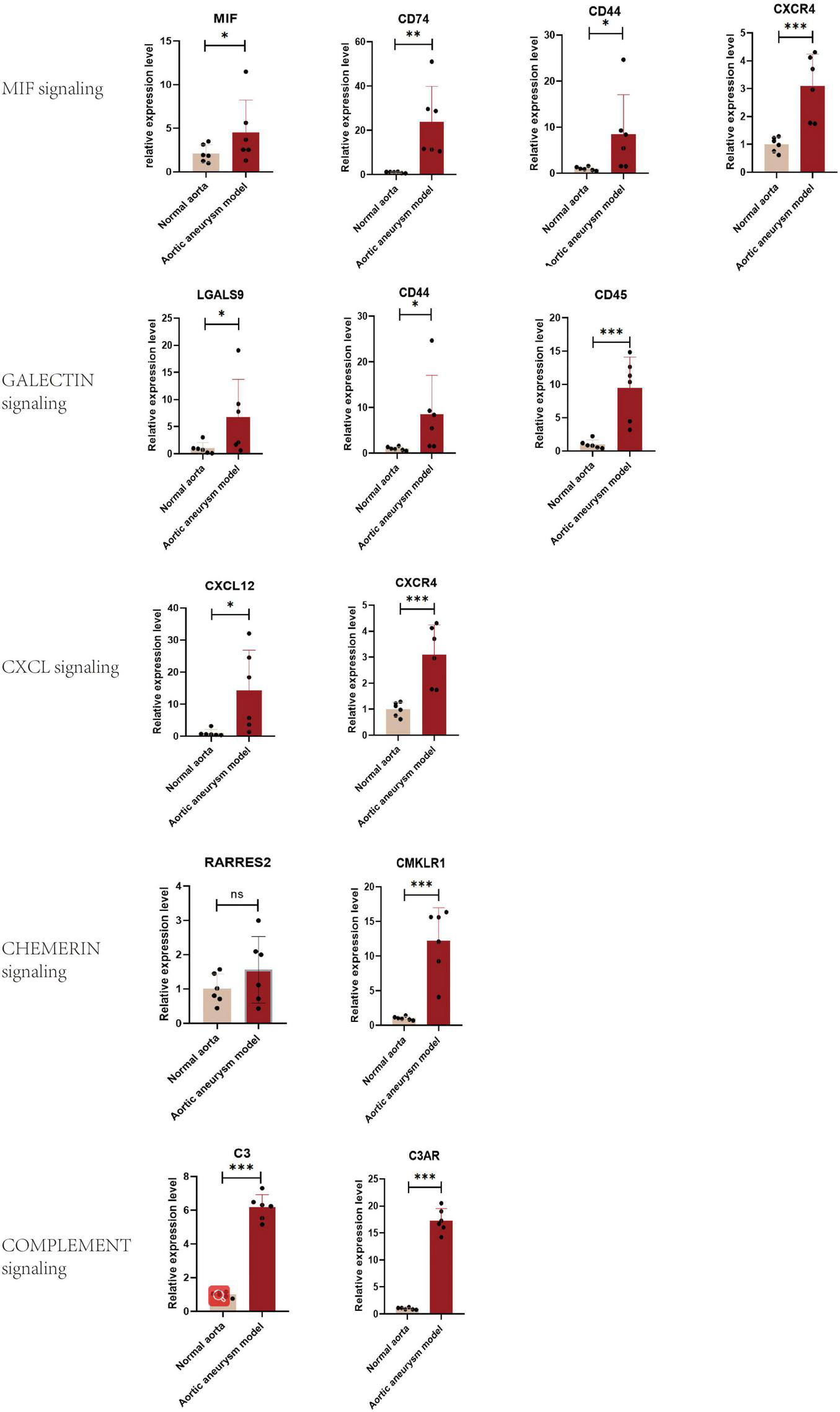 Validation of the expression level of significant ligand–receptor pairs of signaling MIF, galectin, CXCL, chemerin, and complement by qPCR. *P < 0.05, **P < 0.001, ***P < 0.0001.