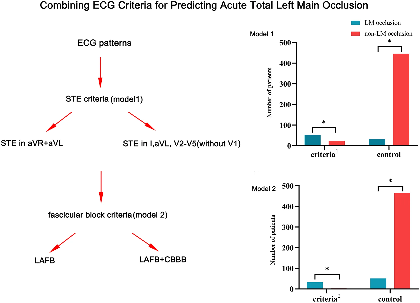 Combining ECG criteria for the prediction of LM occlusion. Model 1: Combination of two STE criteria (STE in both aVR and aVL and STE in I, aVL, V2–V5 without V1); Model 2: combination of two STE criteria and two fascicular block criteria (STE in both aVR and aVL plus LAFB, STE in both aVR and aVL plus LAFB + RBBB, STE in I, aVL, V2–V5 plus LAFB, and STE in I, aVL, V2–V5 plus LAFB + RBBB). LM, left main coronary artery; STE, ST-segment elevation; RBBB, right bundle branch block; LAFB, left anterior fascicular block. *p < 0.05.