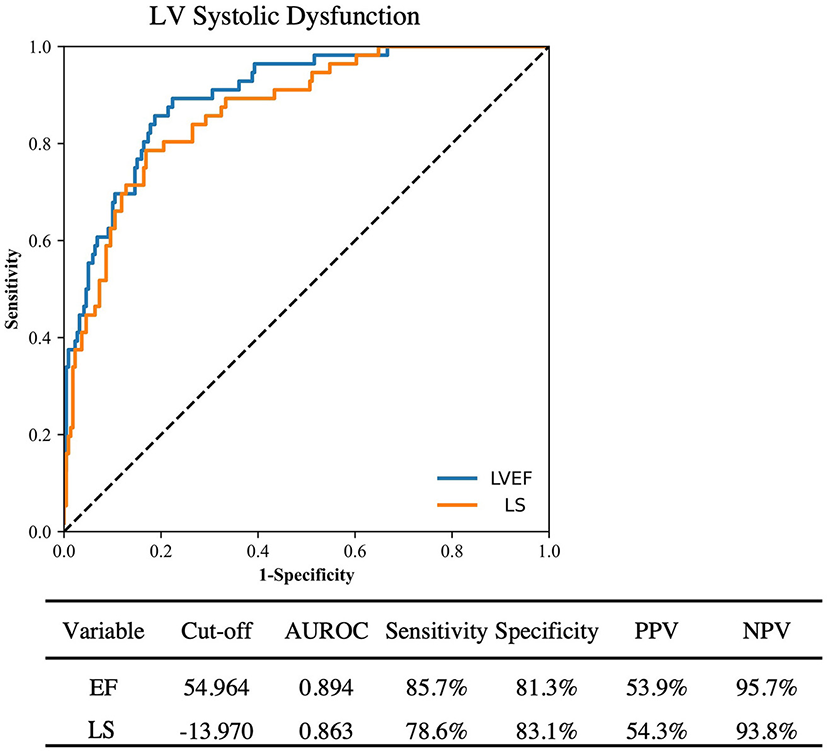 ROC curve analysis for detection of clinically reported LV systolic dysfunction by automated LVEF and LS. PPV, Positive predictive value; NPV, Negative predictive value.