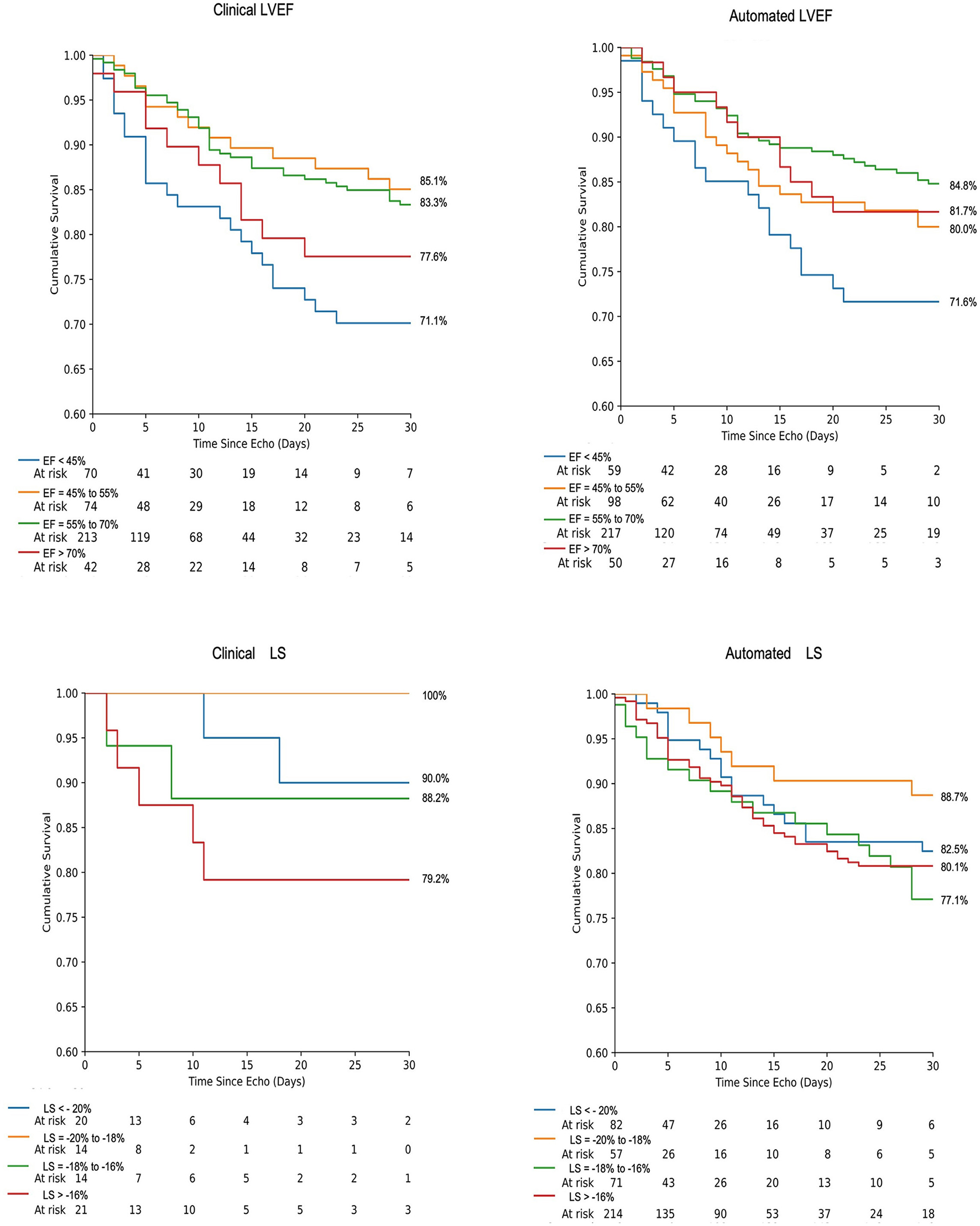 During the first 30 days of hospitalization, death occurred in 103 (21.3%), acute coronary syndrome in 39 (8%), congestive heart failure in 49 (10%), and MACCE in 117 (24.0%). Using logistic regression adjusted by site (Table 4), automated LVEF and LS were associated with in-hospital death (LVEF p = 0.025, LS p = 0.03), ACS (LVEF p < 0.001, LS p < 0.001), CHF (LVEF p < 0.001, LS p < 0.001), acute kidney injury (LVEF p = 0.012, LS p = 0.03), and MACCE during hospital admission (LVEF p < 0.001, LS p < 0.001). Automated LVEF and LS were associated with mortality using Cox regression to account for increased risk over longer durations of hospitalization (LVEF p = 0.017, LS p = 0.033, Supplementary Table 3). Clinically derived LVEF and LS were associated with risk of CHF (LVEF p < 0.001, LS p = 0.001) and MACCE, (LVEF p < 0.001, LS p = 0.001) but not in-hospital death (LVEF p = 0.286, LS p = 0.158) or acute kidney injury (LVEF p < 0.43, LS p = 0.694). Clinical LVEF (p < 0.001) but not LS (p =0.118) was associated with ACS. Cox regression of clinical LVEF and LS was associated with mortality for LVEF (p = 0.019) but not for LS (p = 0.181, Supplementary Table 3).