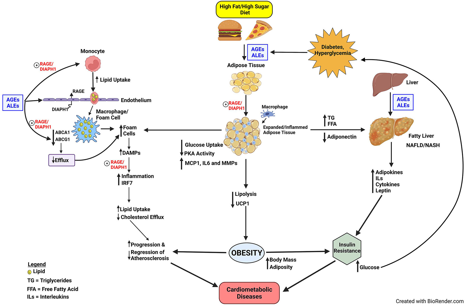 Obesity and non-alcoholic fatty liver disease (NAFLD) are on the rise world-wide; despite fervent advocacy for healthier diets and enhanced physical activity, these disorders persist unabated and, long-term, are major causes of morbidity and mortality. Numerous fundamental biochemical and molecular pathways participate in these events at incipient, mid- and advanced stages during atherogenesis and impaired regression of established atherosclerosis. It is proposed that upon the consumption of high fat/high sugar diets, the production of receptor for advanced glycation end products (RAGE) ligands, advanced glycation end products (AGEs) and advanced lipoxidation end products (ALEs), contribute to the development of foam cells, endothelial injury, vascular inflammation, and, ultimately, atherosclerosis and its consequences. RAGE/Diaphanous-1 (DIAPH1) increases macrophage foam cell formation; decreases cholesterol efflux and causes foam cells to produce and release damage associated molecular patterns (DAMPs) molecules, which are also ligands of RAGE. DAMPs stimulate upregulation of Interferon Regulatory Factor 7 (IRF7) in macrophages, which exacerbates vascular inflammation and further perturbs cholesterol metabolism. Obesity and NAFLD, characterized by the upregulation of AGEs, ALEs and DAMPs in the target tissues, contribute to insulin resistance, hyperglycemia and type two diabetes. Once in motion, a vicious cycle of RAGE ligand production and exacerbation of RAGE/DIAPH1 signaling ensues, which, if left unchecked, augments cardiometabolic disease and its consequences. This Review focuses on RAGE/DIAPH1 and its role in perturbation of metabolism and processes that converge to augur cardiovascular disease.