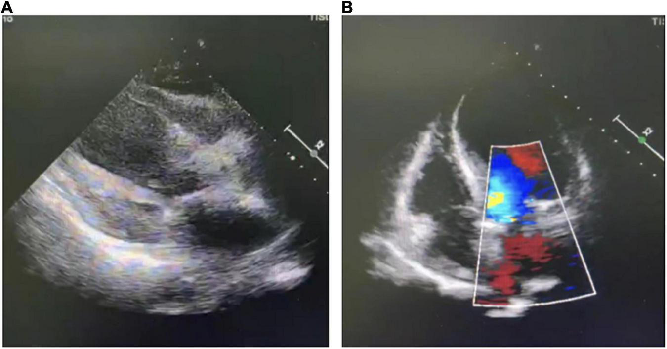 Ultrasonic echocardiogram. (A) Parasternal long axis view; (B) apical four chambers view.