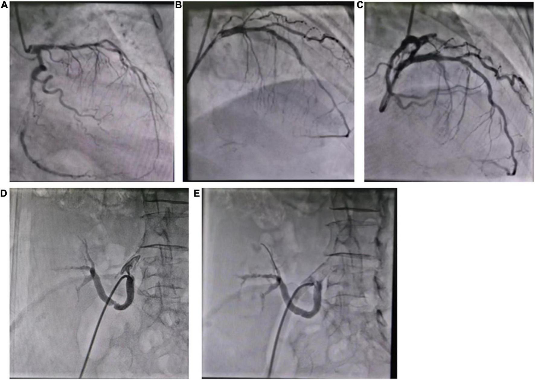 (A) Coronary angiography showed triple-vessel disease; (B) two stents were implanted in LAD; (C) two stents were implanted in LCX; (D) the renal artery angiography; (E) one stent was implanted in the renal artery.