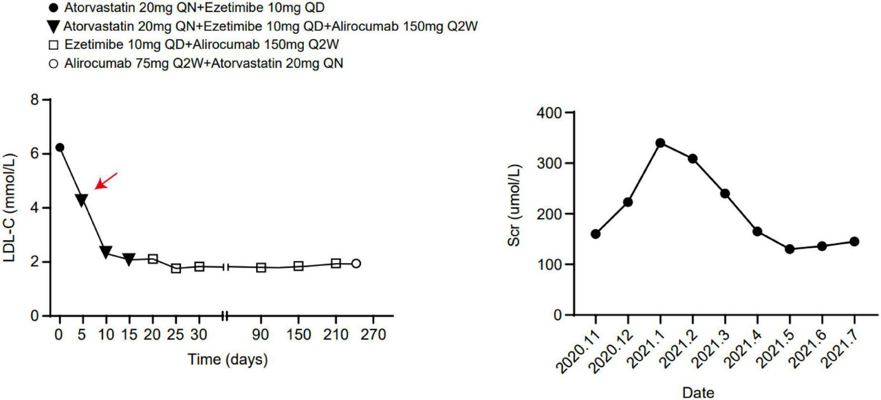 Another aspect worth discussing is the interaction between drugs, especially lipid-lowering drugs, and immunosuppressive agents in kidney transplant recipients, which needs to be closely monitored due to the long-term use of immunosuppressants. Different immunosuppressive agents affect blood lipid levels differently. For example, some immunosuppressants may affect lipoprotein metabolism through lipoprotein lipase inhibition and insulin resistance (15). The other immunosuppressants (e.g., cyclosporine) may increase serum PCSK9 levels. In contrast, mycophenolic acid and azathioprine have few effects on blood lipids. Animal experiments found an elevated plasma level of LDL-c and PCSK9 in LDL-c receptor knockout mice treated with cyclosporine, suggesting that LDL-c receptor-mediated lipoprotein removal has a protective effect on cyclosporine related hyperlipidemia, which means using PCSK9i can enhance the removal of LDL-c and reduce the cyclosporine mediated hyperlipidemia (16). In clinical studies, it was also found that the use of everolimus in certain genotypes and female patients was correlated with the increased concentration of PCSK9, suggesting the increased concentration of PCSK9 caused by immunosuppressive agents was the cause of lipid metabolism disorder (17). However, PCSK9i did not affect the p-glycoprotein pathway that metabolized statins and common immunosuppressant, CYP450, OATP1B1, and BRCP pathways. As a result, PCSK9i rarely interacts with most immunosuppressants in post-transplant patients (15). The combination use of immunosuppressants and PCSK9i has been reported in patients after heart transplantation, confirming its safety and good tolerance (18–20). However, another kidney transplant patient who received alirocumab in combination with everolimus for 2 years developed severe lung infections twice during the treatment period. After the replacement of everolimus with azathioprine, no recurrence of pneumonia was found (21). In addition to the relationship between PCSK9i and immunosuppressants, the potential drug interactions between statins and immunosuppressants must also be considered, especially with cyclosporine, which is metabolized through CYP3A4 and may increase the blood levels of all statins’ exposure and the risk of myopathy (1). The effectiveness of statin in renal transplant patients was uncertain; the guideline recommended statin to be the first-line agent in transplant patients but initiation should be at low doses with very careful observation (5). However, everolimus, of the same classification of calcineurin inhibitor (CNI) as cyclosporine, rarely has drug-drug interaction with atorvastatin (1). Therefore, choosing the appropriate combination of statin and immunosuppressant is essential in post-transplant patients. As for the interaction between ezetimibe and immunosuppressants, it has been confirmed by previous studies that the combination of the two drugs is relatively safe and effective (22). In statin-intolerant patients or those still with dyslipidemia despite maximally tolerated statin treatment, alternative or additional therapy with ezetimibe may be considered (5). Notably, cyclosporine can induce a 2–12 fold increase in the ezetimibe level. Our patient was administrated with cyclosporine, mycophenolic acid, and prednisone, and during the combined use of PCSK9i, statin, and ezetimibe, the cyclosporine plasma concentration was monitored to guide the drug dosage, atorvastatin was halted due to the rhabdomyolysis during the hospitalization. The patient reinitiated the statin and reduced the dosage of PCSK9i for financial reasons. Fortunately, no serious drug interaction was found during the follow-up.