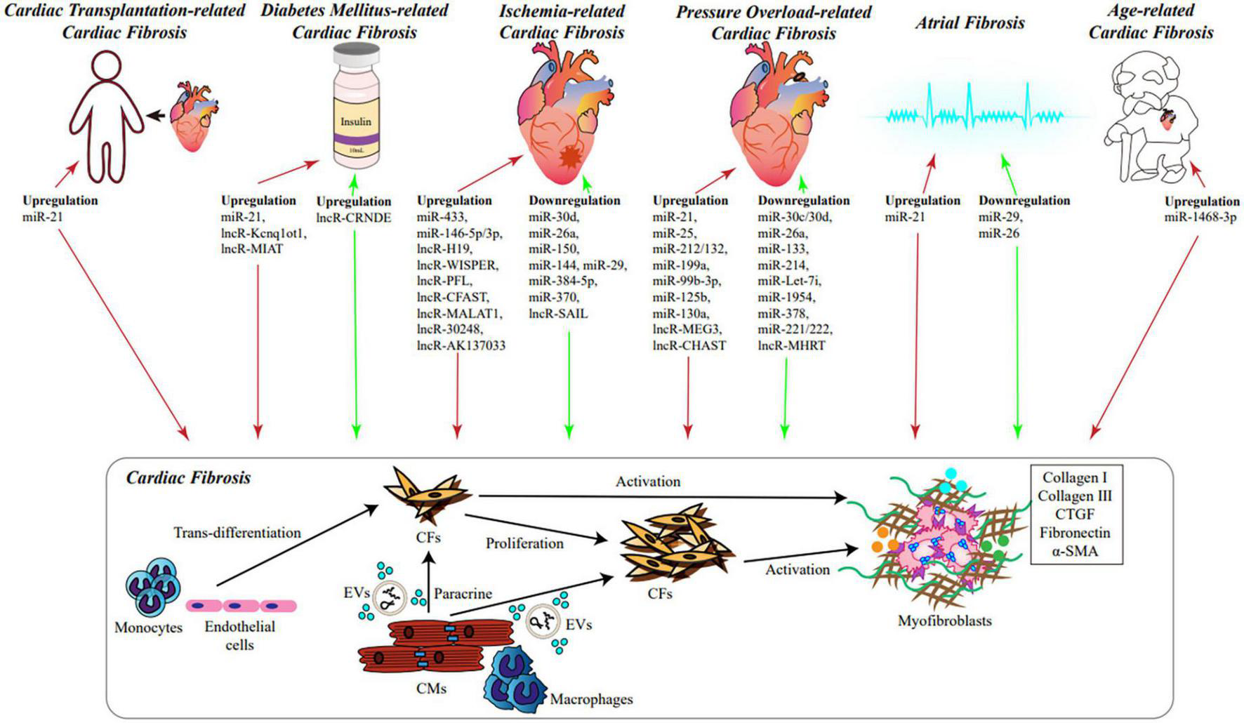Three-quarters of the human genome can be transcribed into RNA, while protein-coding genes represent only 2% of the whole genome (3) and residual transcripts are non-coding RNAs (ncRNAs). These ncRNAs transcripts mainly include microRNAs (miRNAs) and long ncRNAs (lncRNAs). MiRNAs are a class of small (≈22 nucleotides long) ncRNAs that induce gene silence by binding to the 3′ untranslated regions of target mRNAs in most cases. Interaction of miRNAs with 5′ untranslated regions or coding region of mRNAs also exists in a few cases (4). LncRNAs are defined as RNAs longer than 200 nucleotides, which are not translated into functional proteins. Regulatory mechanisms of LncRNAs on genes expression are complex and mediated by their interaction with DNA, RNA, and protein (5). Many studies have proved that ncRNAs play a crucial role in various cardiac diseases, including cardiac fibrosis. This review will summarize the role of miRNAs and lncRNAs in cardiac fibrosis, meanwhile discuss the potential role of these ncRNAs as novel biomarkers and therapeutic candidates.