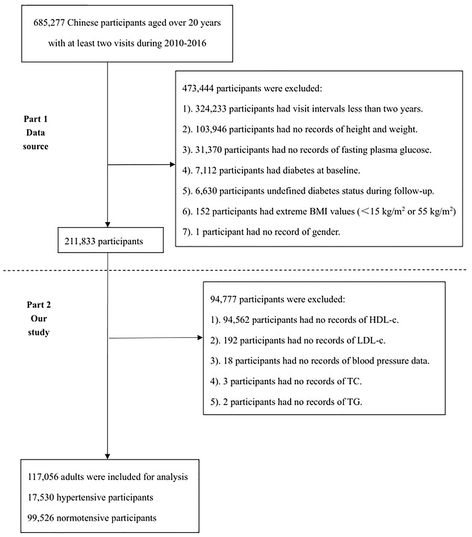 Here, a secondary analysis on the results given by Chen et al. is made. The dataset was downloaded from a public database (www.Datadryad.org) and contained baseline information of 211,833 participants. Therefore, the inclusion criteria were consistent with the original study, with non-type 2 diabetic adults aged between 20 and 99 years and having at least two visits between 2010 and 2016, along with complete information on participants' height, weight and FPG. As shown in Figure 1, the selection of participants consisted of two parts. The first part is the flowchart of the original study with a total of 211,833 participants included, and the specific reasons for exclusion are listed below: 1). 324,233 participants had visit intervals <2 years; 2). 103,946 participants had no records of height and weight; 3). 31,370 participants had no records of fasting plasma glucose; 4). 7,112 participants had diabetes at baseline; 5). 6,630 participants were not defined as diabetes status during follow-up; 6). 152 participants had extreme BMI values (<15 kg/m2 or 55 kg/m2); 7). 1 participant had no record of gender. The second part is the flowchart of the current study, where only participants with complete information on lipid profile were included. For this reason, 94,777 participants were excluded for the following specific reasons: 1). 94,562 participants had no records of HDL-C; 2). 192 participants had no records of LDL-C; 3). 18 participants had no records of blood pressure data; 4). 3 participants had no records of TC; 5). 2 participants had no records of TG. Finally, 117,056 adults were included, featuring 17,530 hypertensive participants and 99,526 normotensive participants.