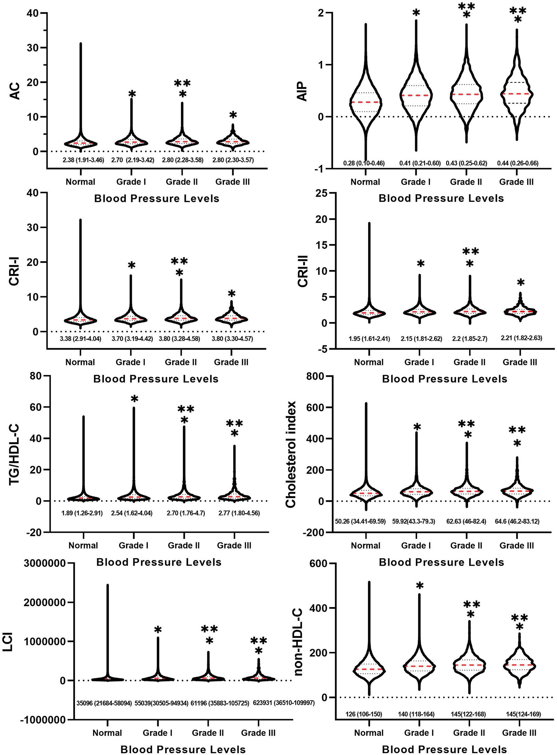 As displayed in Figure 2, the atherosclerotic indices were obviously higher in the hypertensive population compared to those in the normotensive group, regardless of high blood pressure levels (p < 0.05). In addition, among the hypertensive population, AC, CRI-I, and CRI-II were significantly higher in the grade 2 group than in the grade 1 group (p < 0.05), whereas there were no significant differences between the grade 3 and grade 1 groups. Meanwhile, AIP, TG/HDL-C, the cholesterol index, LCI, and non-HDL-C were noticeably higher in the grade 2 and grade 3 groups than in the grade 1 group (p < 0.05), while there was no significant difference between the grade 3 and grade 2 groups.