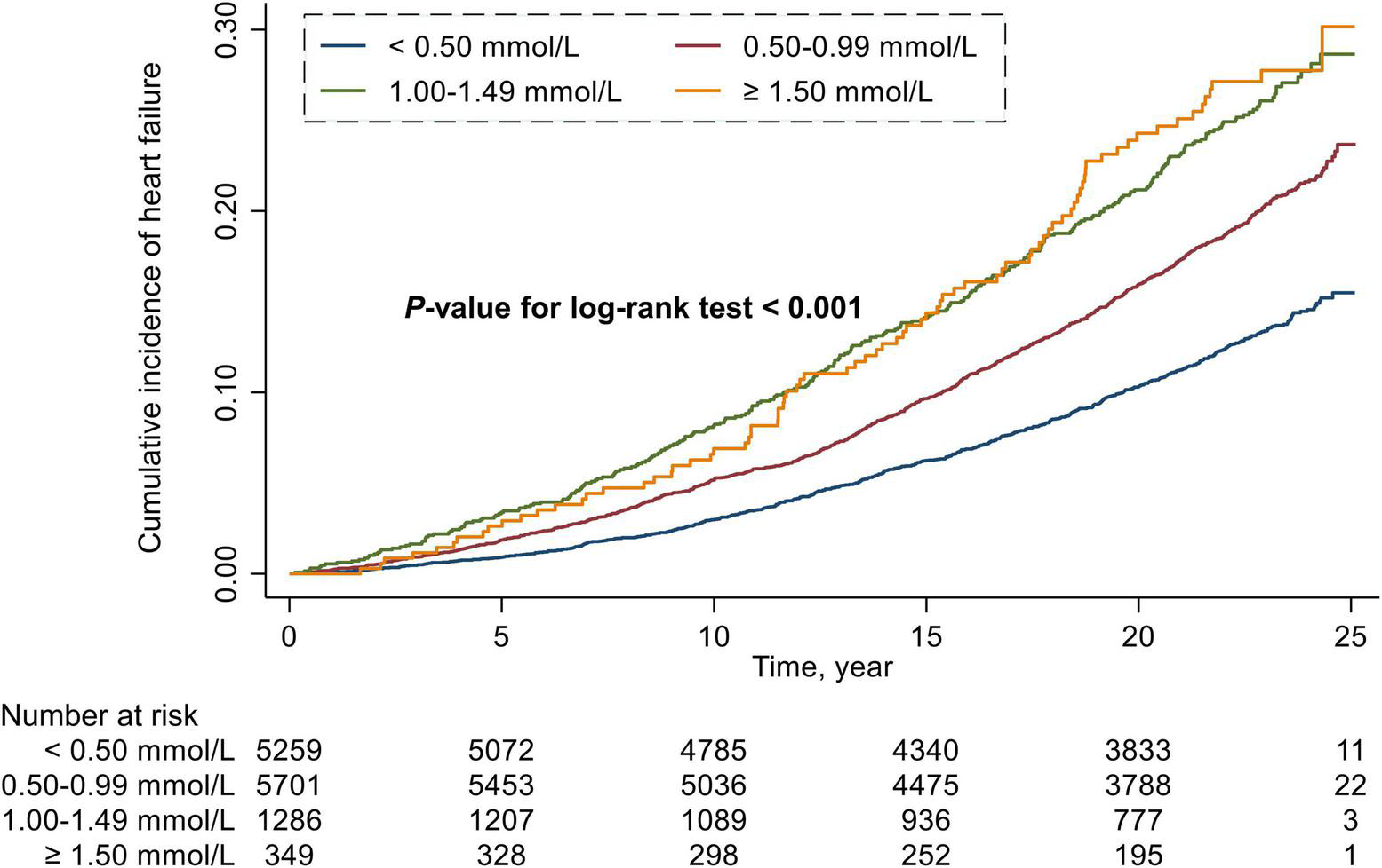 Baseline characteristics are presented as the mean (standard deviation [SD]) for continuous variables or number (%) for categorical variables. All included participants were classified into four groups according to the RC level at baseline (<0.50 mmol/L, 0.50–0.99 mmol/L, 1.00–1.49 mmol/L, and ≥1.50 mmol/L). We constructed Kaplan–Meier graphs and used the log-rank test to assess differences in the cumulative incidence of HF among four groups. The multivariable-adjusted Cox proportional hazards models were used to estimate the hazard ratio (HR) (95% confidence intervals [CIs]) for HF associated with the RC level, including the following covariates: model 1: age, sex, race; model 2: variables in model 1 plus education level, BMI, smoking status, drinking status, SBP, DBP, eGFR, prevalent hypertension, diabetes mellitus, and medication histories of aspirin and antihypertensive drugs; and model 3: variables in model 2 plus total cholesterol, LDL-C, cholesterol-lowering medication. The continuous association between RC and the risks of HF was also assessed by using multivariable-adjusted Cox proportional hazards models and the restricted cubic spline models with three knots.
