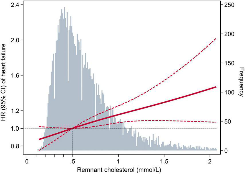 Adjusted hazard ratios (95% confidence interval) for the association of the remnant cholesterol level with the risk of heart failure. Hazard ratios (indicated by a dark-red solid line) and 95% confidence intervals (dark-red dotted lines) are derived from the multivariable-adjusted Cox regression model, adjusted for age, sex, race, education level, body mass index, smoking status, drinking status, systolic blood pressure, diastolic blood pressure, estimated glomerular filtration rate, prevalent hypertension, prevalent diabetes mellitus, use of aspirin and antihypertensive drugs, total cholesterol, low-density lipoprotein cholesterol, use of cholesterol-lowering medication. The remnant cholesterol level was centered at 0.5 mmol/L and modeled using a restricted cubic spline with knots at the 5th, 50th, and 95th percentiles. The black dotted line is the reference line as hazard ratio = 1. Histograms represent the frequency distribution of remnant cholesterol.