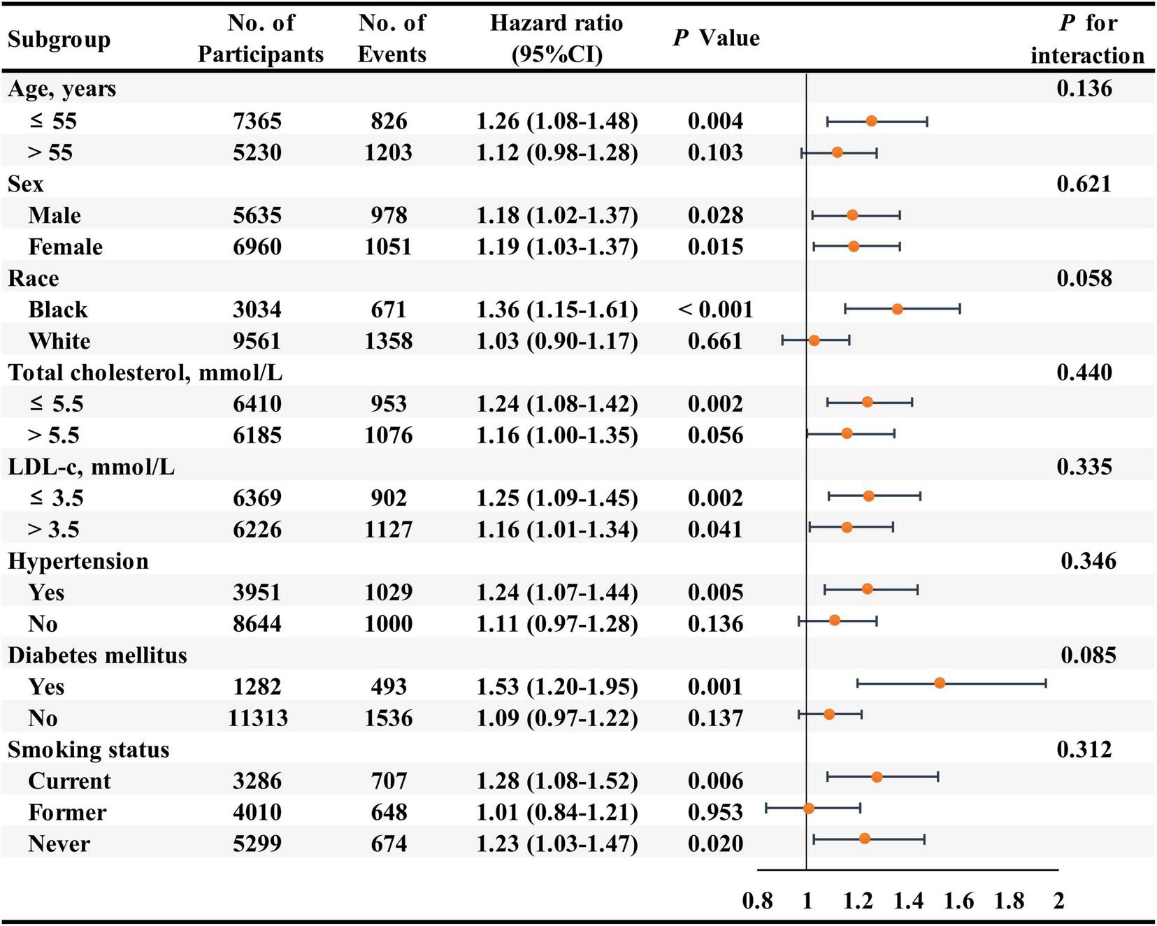 In addition, we combined the participants with RC of 0.50 to 0.99 mmol/L, 1.00 to 1.49 mmol/L, and ≥1.50 mmol/L into one group to conduct the subgroup analyses due to the higher HF risk for them compared with the participants with RC < 0.50 mmol/L. In subgroup analyses of key variables (age, sex, race, total cholesterol, LDL-c, hypertension, diabetes, and smoking status), although the different risks of HF in the subgroups of age, race, total cholesterol, hypertension, diabetes, and smoking status, interaction testing revealed no heterogeneity (all P > 0.05) (Figure 3).