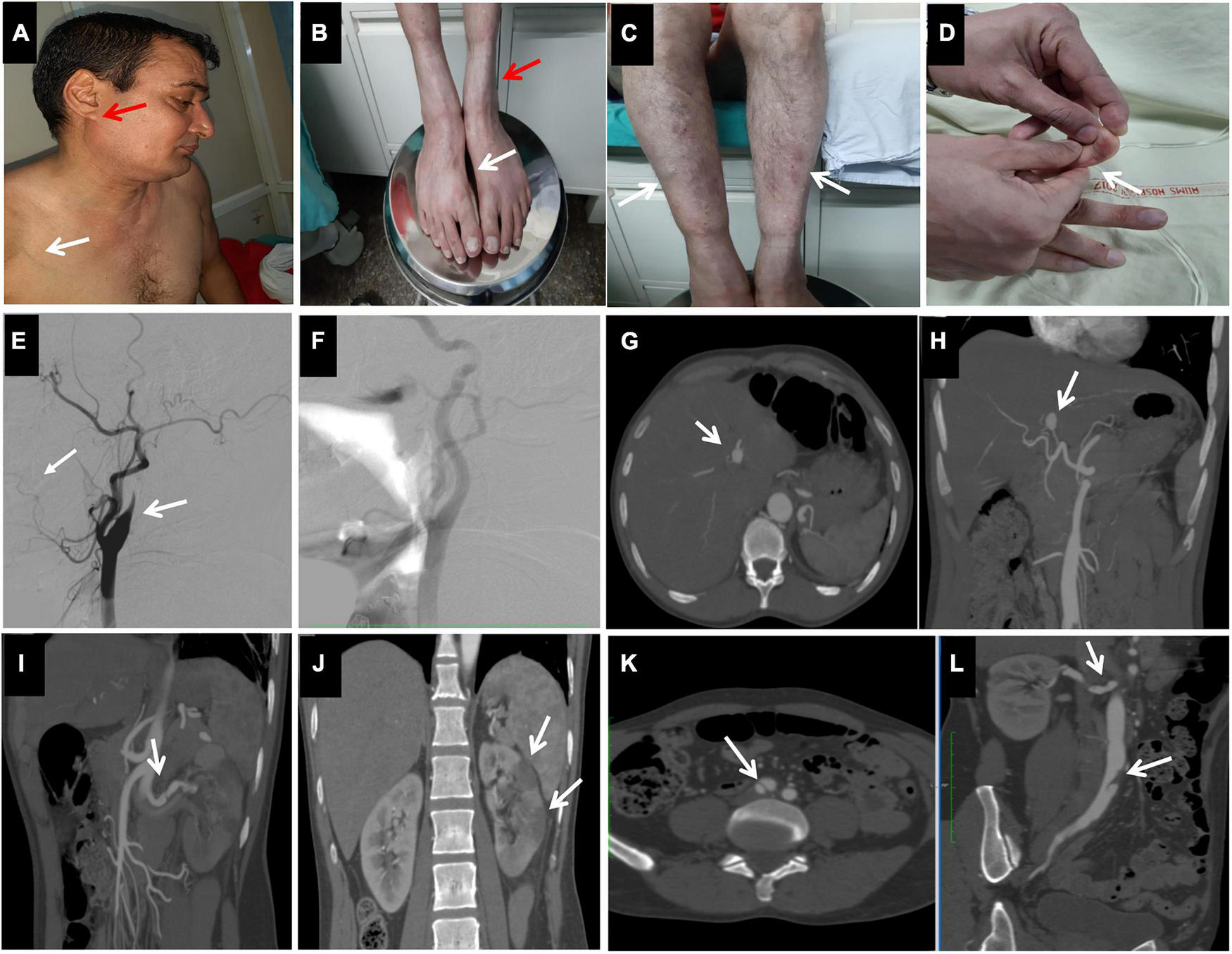 Observed clinical features of the patient, (A): Thin Nose, lobe less ear (red arrow), thin skin with visible chest veins (white arrow), (B): Acrogeria (red arrow) with club foot (white arrow), (C): Easy bruising and thin skin, varicose veins, (D): Hypermobility of small joints (shown in distal phalange of index finger). Digital subtraction angiography images of bilateral common carotid arteries showing dissection of left internal carotid artery (E,F). Right internal carotid artery was normal. Axial (G) and coronal (H) maximum intensity projection (MIP) CT images showing aneurysmal dilatation of left hepatic artery. Coronal MIP images (I,J) of contrast enhanced CT show dissection involving left renal artery with multiple infarcts of renal parenchyma. Axial (K) and coronal (L) MIP CT images show dissection involving right renal artery and right common iliac artery.