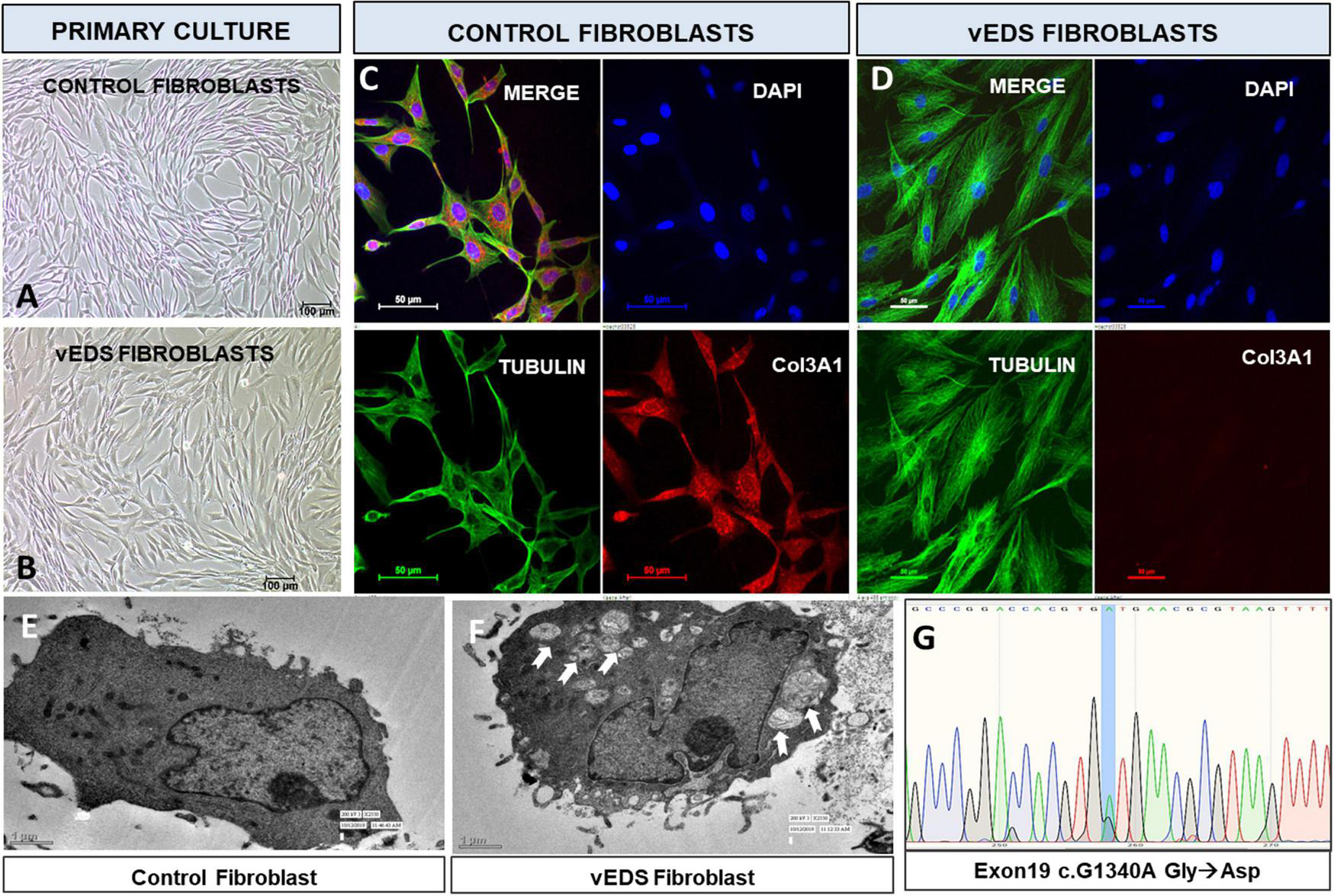 Primary culture of skin derived fibroblasts from (A) age matched control (B) suspected vEDS patient. Immunofluorescence analysis of fibroblasts show (C) presence of Col3A1(Red) control fibroblasts whereas (D) patient fibroblasts show absence of Col3A1. Transmission electron microscopy of (E) control fibroblasts with normal morphology, (F) vEDS fibroblasts with altered morphology, arrows show intracytoplasmic lamellar vacuolar bodies. (G) Sequences of wild-type (1340-G) and mutant (1340-A) COL3A1 cDNA derived from patient skin fibroblasts. As vEDS patient is heterozygous for COL3A1 c.1340G > A mutation, sequencing of the region harboring the mutation results in detection of both guanine and adenine at position 1340. The G > A mutation leads to an exchange from glycine to aspartic acid at the protein level.