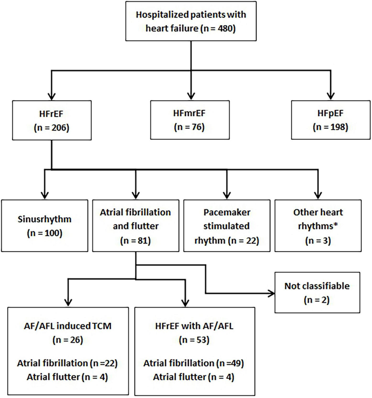 In total, 206 (42.9%) patients presented with HFrEF. Of these 206 patients, 100 (48.5%) were in sinus rhythm at the time of hospital admission, 22 (10.7%) had a pacemaker-stimulated rhythm, and three (1.5%) demonstrated another rhythm than AF or AFL (sustained ventricular tachycardia, n = 1; persistent AV block II°, n = 1; persistent AV block III°, n = 1). In the remaining 81 patients, classification was not possible in two patients (2.5%) because neither the history nor the follow-up results were conclusive. These two patients were excluded from the analysis.