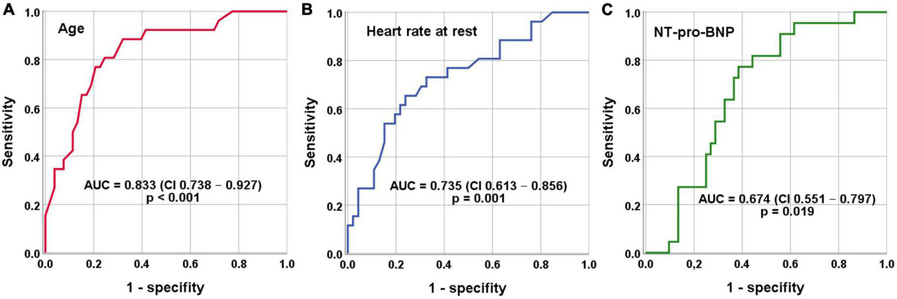 Receiver operating characteristics (ROC) analysis for indication of AF/AFL induced TCM. (A) Cut-off value age <79 years (sensitivity = 89% and specificity = 68%). (B) Cut-off value heart rate at rest >112 beats per minute (sensitivity = 73% and specificity = 67%). (C) Cut-off value NT-proBNP <5,419 pg/mL (sensitivity = 73% and specificity = 64%).