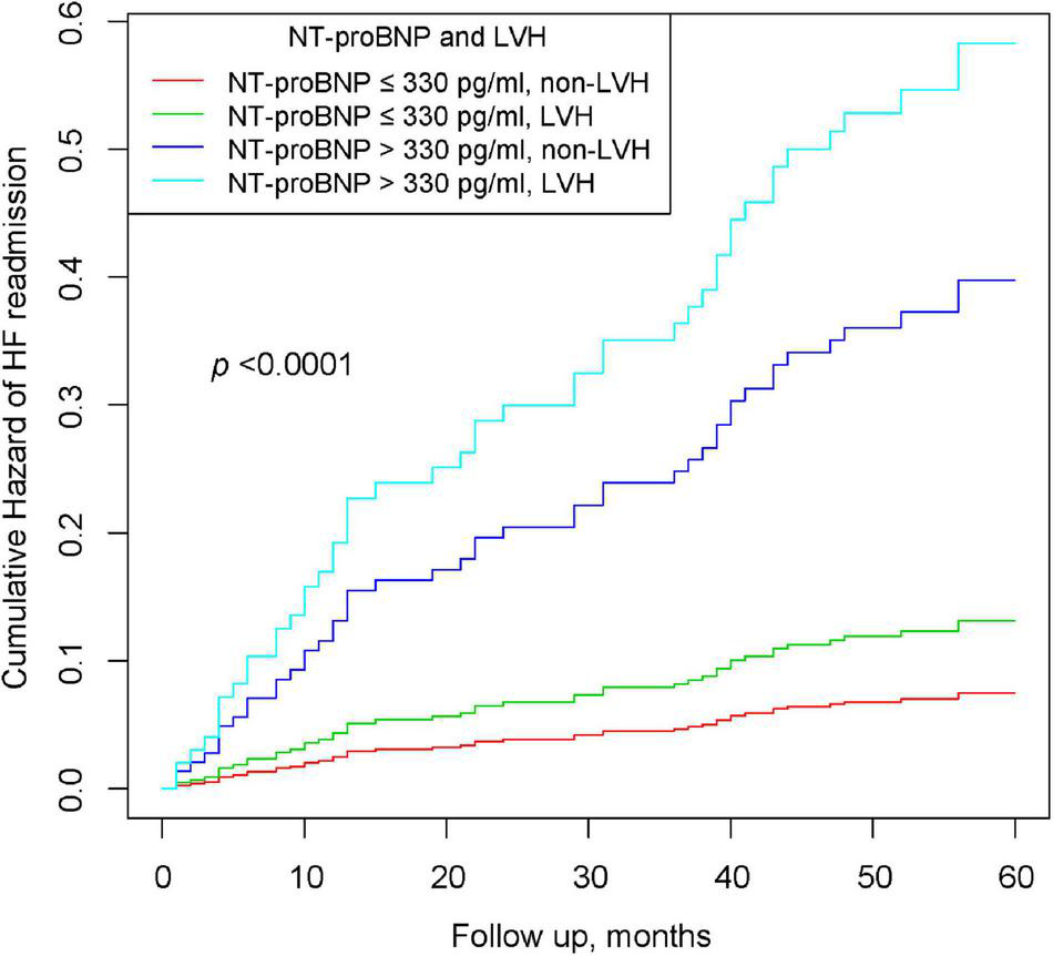 A total of 224 (11.56%) elderly diabetic patients with RVP were included in the study. During the 5-year follow-up period, a total of 46 (20.54%) patients suffered HF readmission events. Multivariate Cox proportional hazards regression analysis showed that higher levels of NT-proBNP and LVMI were independent risk factors for HF readmission [NT-proBNP: hazard risk (HR) = 1.05, 95% confidence interval (CI): 1.01–1.10; LVMI: HR = 1.14, 95% CI: 1.02–1.27]. The optimal cut-off point of NT-proBNP was determined to be 330 pg/ml by receiver operating characteristic (ROC) curve analysis. Patients with NT-proBNP > 330 pg/ml and LVH had a higher risk of HF readmission compared to those with NT-proBNP ≤ 330 pg/ml and non-LVH (39.02% vs. 6.17%; HR = 7.72, 95% CI: 1.34–9.31, P < 0.001).