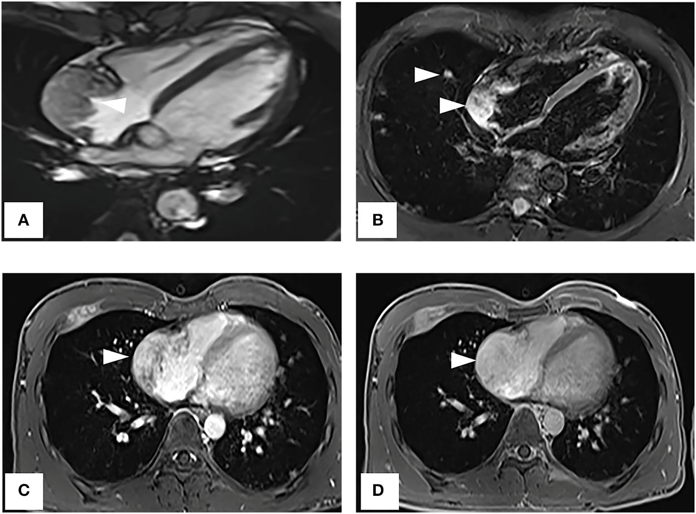 Cardiac magnetic resonance imaging. (A) On SSFP cine imaging planned in the four chambers, the tumor shows isointense (arrowhead). (B) On T2-short tau inversion recovery sequence images, the tumor displays high-signal intensity (arrowhead). (C,D) On enhanced MR imaging, the tumor shows arterial heterogeneous enhancement and progressive but incomplete enhancement in the delayed phase (dynamic acquisition).
