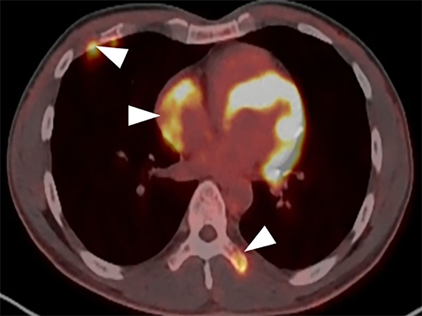 PET-CT demonstrates the tumor intensely increased FDG uptake with bony metastases (arrowhead).