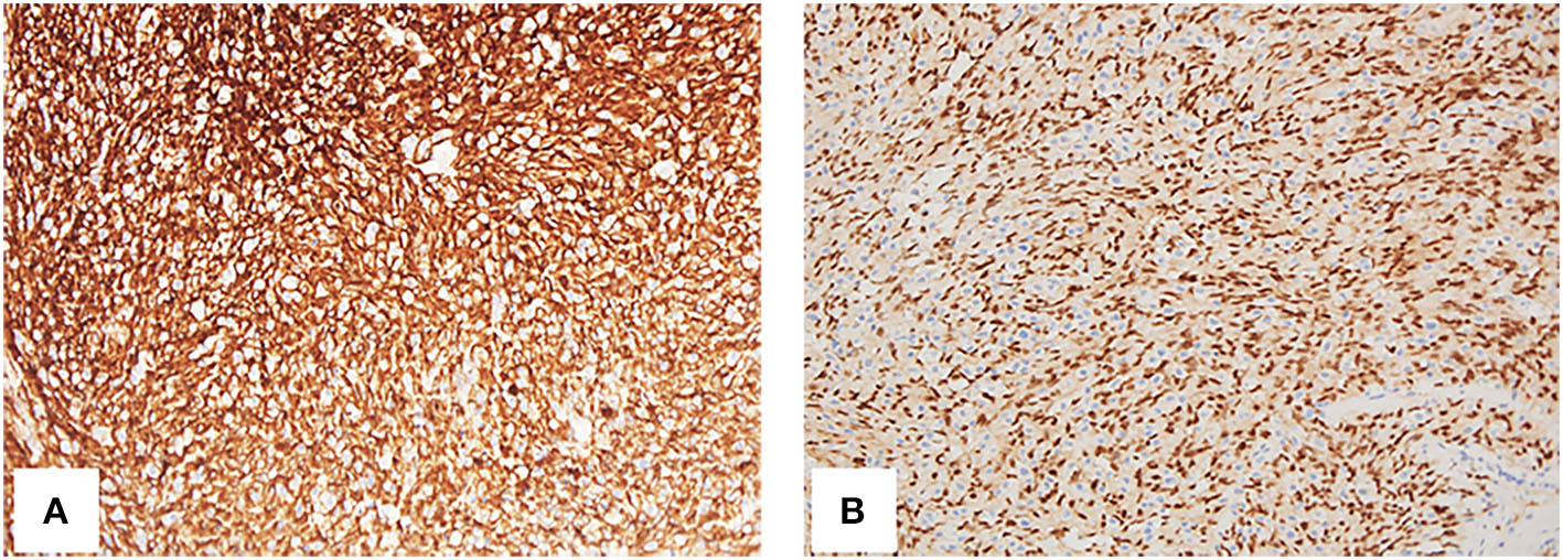 To get a definitive diagnosis, the patient underwent the sacral biopsy, but the result was a benign vascularized lesion, which was in contradiction with the presentations on images, so the left lower lung nodule resection was performed. The histopathology examination and immunohistochemical staining supported the diagnosis of angiosarcoma positive for CD31, CD34, ETS-related gene (ERG), and Ki67 (LI: 60%) (Figures 4A,B). Combined with multimodality images, the final diagnosis was primary right atrial angiosarcoma with multiple metastases. The case was discussed in a multidisciplinary heart team meeting. Because of the presence of widespread metastases, curative treatment was considered to be impossible. The clinician suggested palliative chemotherapy and immunotherapy, and the patient agreed with the suggestion. Thus, the patient underwent chemotherapy and immunotherapy with epirubicin (10 mg, QD), ifosfamide (.5 g, QD), and pembrolizumab (100 mg, QD). Simultaneously the patient underwent palliative radiotherapy (20 Gy/5f) at the sites of the 10th thoracic vertebra. Up to now, the patient has undergone four cycles of treatment.