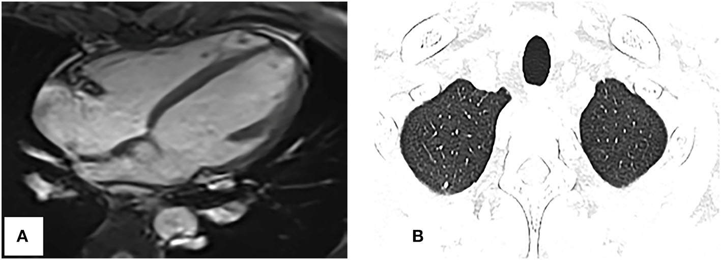 Repeat CMRI and chest CT showed significant regression of the tumor and pulmonary metastases (Figures 5A,B). Now, the patient continues the chemotherapy and immunotherapy.