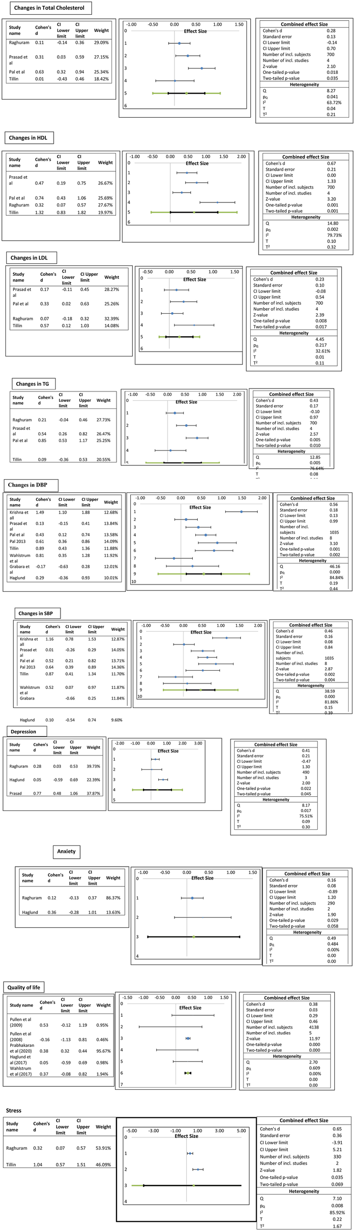 The results show that yogic interventions resulted in significant reduction in systolic (d = 046; 95% CI.08–0.84; I2 = 81.86%) and diastolic blood pressures (d = 0.56; 95% CI.13–0.99, I2 = 84.84%). A medium statistically significant increase in HDL (d =0.67; 95% CI 0 to 1.33; I2 79.7%) and a low but significant effect on LDL (d = 0.23; 95% CI −0.08–0.54; I2 32.61%), total cholesterol (d =0.28; 95% CI −0.14–0.7; I2 63.72%), and triglycerides (d = 0.43; 95% CI −0.1–0.97; I2 76.64%) were observed. Pooled effect sizes showed a medium to low statistically significant effect on psychosocial indicators viz., QoL, stress, anxiety, and depression.