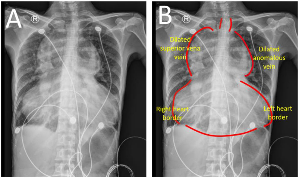 Chest radiograph (A,B). A huge “calabash” heart presented as appearance according to chest radiograph. The mediastinum is obviously in relation to heart border. TAPVR, total anomalous pulmonary venous return.