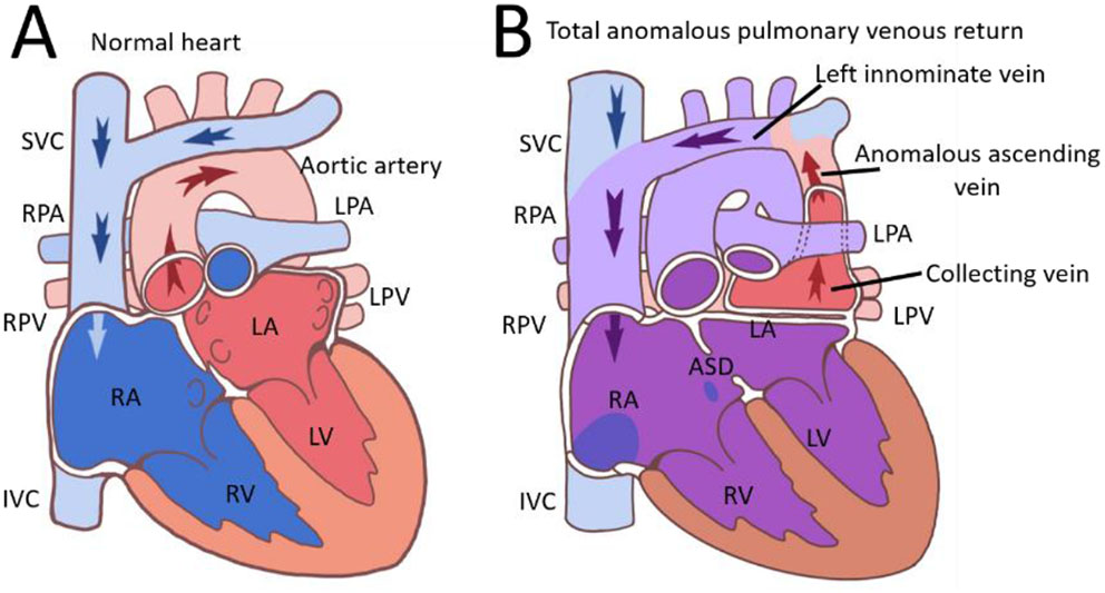 Images of normal heart (A) and supracardiac TAPVR (B) were presented. ASD, atrial septal defect; IVC, superior vena cava; LA, left atrium; LPA, left pulmonary artery; LPV, left pulmonary vein; LV, left ventricular; RPA, right pulmonary artery; RPV, right pulmonary vein; SVC, superior vena cava; TAPVR, total anomalous pulmonary venous return.