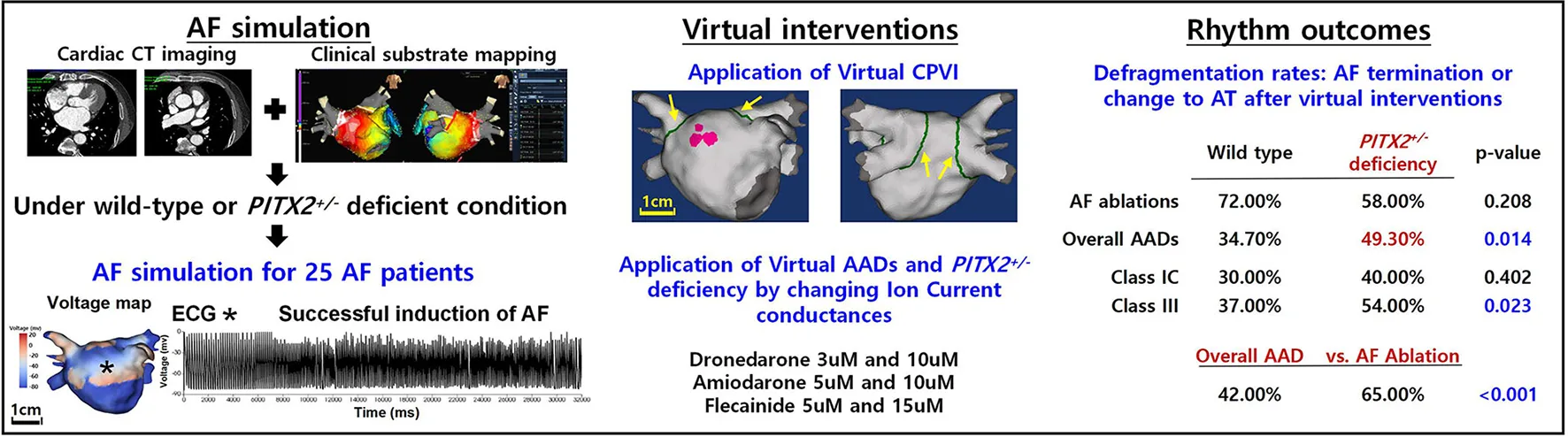 In this study, we explored the response and mechanism of AFCA and AADs according to the patient PITX2 genotype. We used AF computational modeling integrated with clinical electroanatomical maps of 25 AAD-resistant or intolerable patients with AF who underwent AFCA, and the effects of various virtual interventions (AFCA and three different AADs) attempted under the same conditions were compared and evaluated. The ion currents associated with baseline AF and AADs (amiodarone, dronedarone, and flecainide) according to the genotype (wild type and PITX2+/− deficient) were defined by the relevant publications.