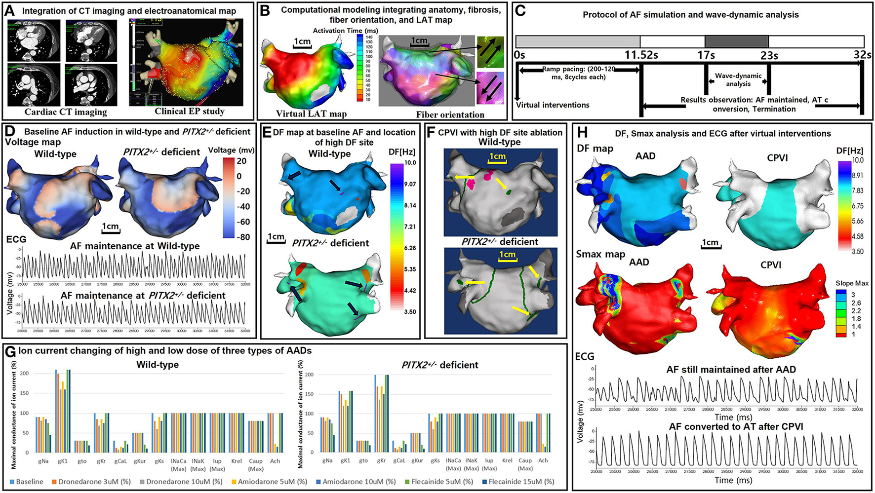 Study protocol of the computational atrial modeling, AF simulation, and virtual interventions. (A) Integration of the CT imaging and electroanatomical map. (B) Computational modeling integrating the anatomy, fibrosis, fiber orientation, and LAT map. (C) Protocol of the AF simulation and wave-dynamic analysis. AF was induced in each case using AF pacing from 200 to 120 ms with eight beats per cycle lasting a total of 11,520 ms based on the wild-type PITX2+/− deficient AF baseline ion current settings. AF maintenance was observed for 20,480 ms after induction (overall 32 s including pacing), and the wave dynamics of the DF and Smax were analyzed from 17,000 to 23,000 ms. (D) Baseline AF induction under wild-type and PITX2+/− deficient backgrounds. The voltage maps and ECGs indicate a successful AF induction during the wild-type and PITX2+/− deficient baselines. (E) 3D DF map of the baseline AF under wild-type and PITX2+/− deficient backgrounds. The black arrows indicate the locations of the high DF sites on the 3D DF map. (F) Virtual CPVI with a high DF site ablation. The green lines indicate the CPVI and yellow arrows indicate the ablated regions of the high DF sites. The pink sites indicate the pacing site. (G) Ion current changes with the high and low doses of the three types of AADs. Ion current changes with the high and low doses of the three types of AADs under the wild-type and PITX2+/− deficient backgrounds. For PITX2+/− deficiency, the IK1 decreased by 25% and the IKr increased by 100% as compared to that with the wild-type status, while the other ion currents remain the same as the wild-type. (H) Smax and DF analysis after AADs and the CPVI. The ECGs indicate AF was maintained after AADs, and AF converted to AT after the CPVI. CT, computed tomography; EP, electrophysiology; LAT, local activation time; PITX2, paired-like homeodomain transcription factor 2; CPVI, complete pulmonary vein isolation; DF, dominant frequency; Smax, the Maximal slope of the restitution curves; AF, atrial fibrillation; AT, atrial tachycardia; ECG, electrocardiogram; AAD, antiarrhythmic drug.