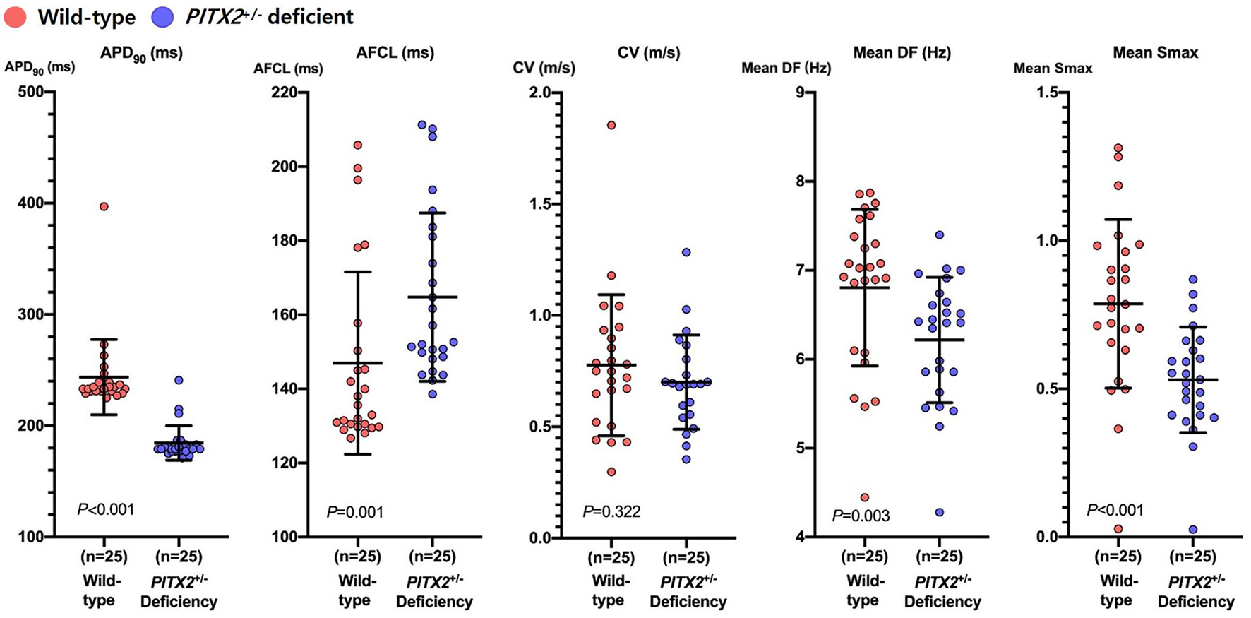 Characteristics of wild-type and PITX2+/− deficient baseline AF. Genotype-dependent comparisons of the APD90, CV, mean Smax, mean DF, and AFCL depend on the baseline AF. Every group includes an identical number of samples (n = 25). APD90, action potential duration 90%; CV, Conduction velocity; Smax, the Maximal slope of the restitution curves; AFCL, AF cycle length; DF, Dominant frequency; PITX2, paired-like homeodomain transcription factor 2.