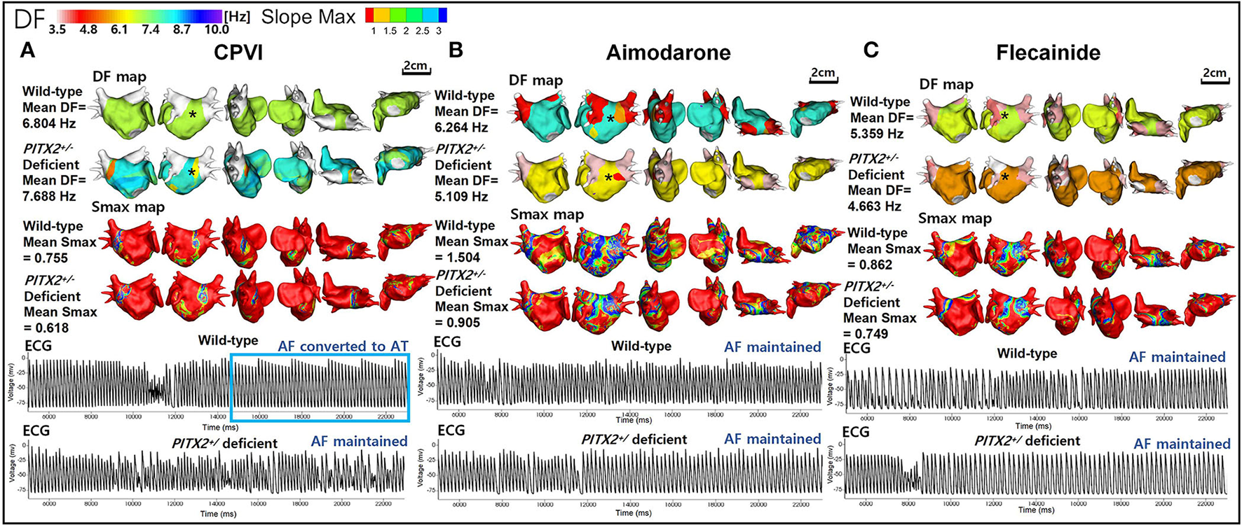 Wave-dynamic change after a virtual CPVI and AADs. (A) The ECGs were obtained at the black * sites in the DF maps and indicate that AF converted to AT after the CPVI during a wild-type condition was still maintained during a PITX2+/− deficient condition. (B) The ECGs were obtained at the black * sites in the 3D DF maps and indicate that AF was still maintained after high dose amiodarone under both wild-type and PITX2+/− deficient backgrounds. (C) The ECGs were obtained at the black * sites in the DF maps and indicate that the AF was still maintained after high dose flecainide under both wild-type and PITX2+/− deficient backgrounds. DF, dominant frequency; Smax, the maximal slope of the restitution curves; CPVI, complete pulmonary vein isolation; AF, atrial fibrillation; AT, atrial tachycardia; ECG, electrocardiogram; PITX2, paired-like homeodomain transcription factor 2.