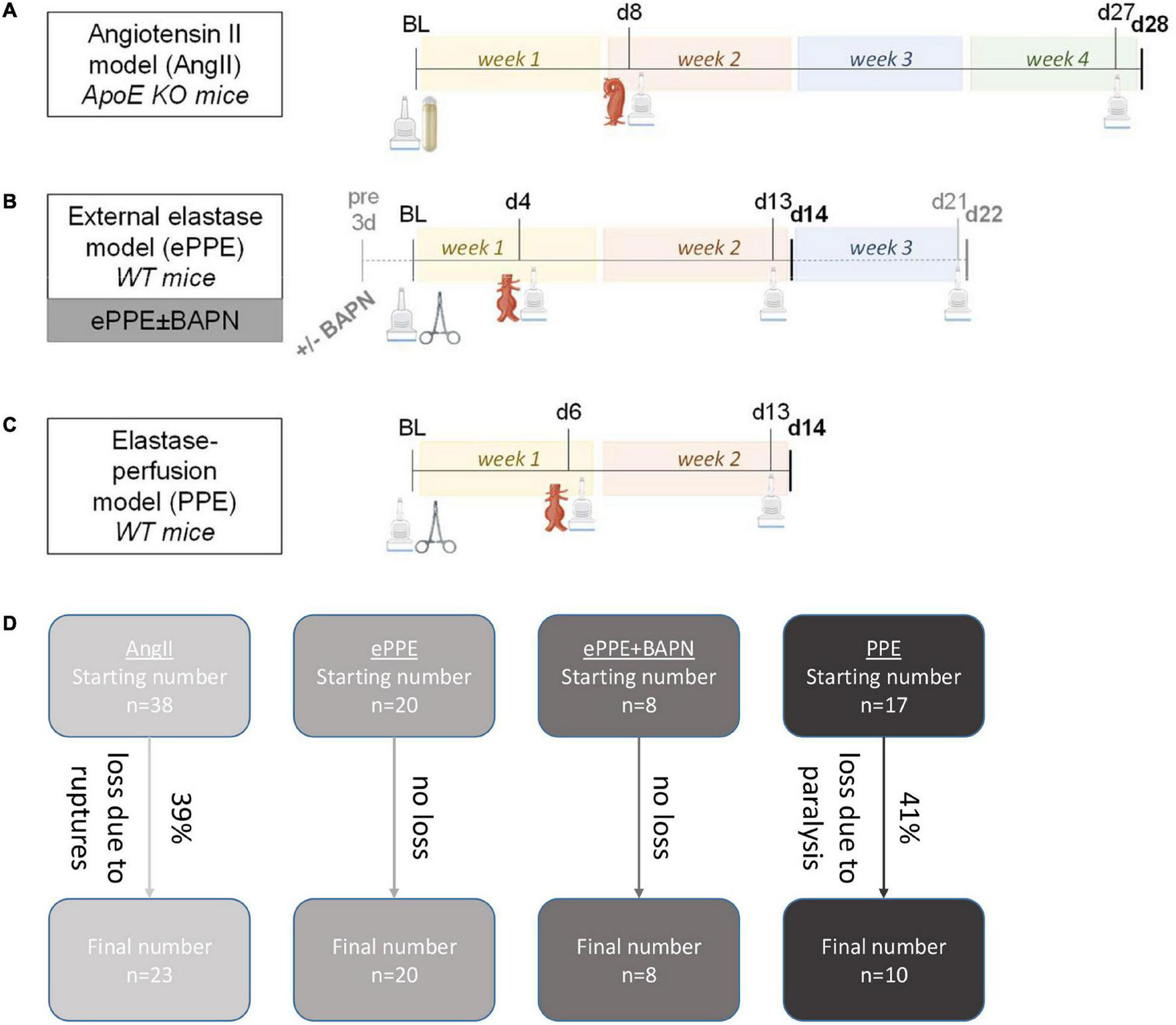 Experimental design of AAA mouse models. Experimental steps and time lines are illustrated for the (A) AngII model, (B) ePPE ± BAPN models and (C) PPE model. Time points of 3D US analysis are indicated by the scanner icon, while interventions at baseline to trigger AAA development are illustrated by osmotic pump for the AngII model or by surgical clamp for the elastase-based models. Formed aneurysms were either of suprarenal (AngII) or infrarenal (elastase models) localization. For the ePPE + BAPN model (gray lettering), BAPN was administered from 3 days before surgical intervention until day 22 as opposed to the ePPE model without BAPN which was terminated on day 14. (D) The flow chart illustrates starting numbers and animal losses in the four mouse models resulting in the final number of mice included in the follow-up time points.