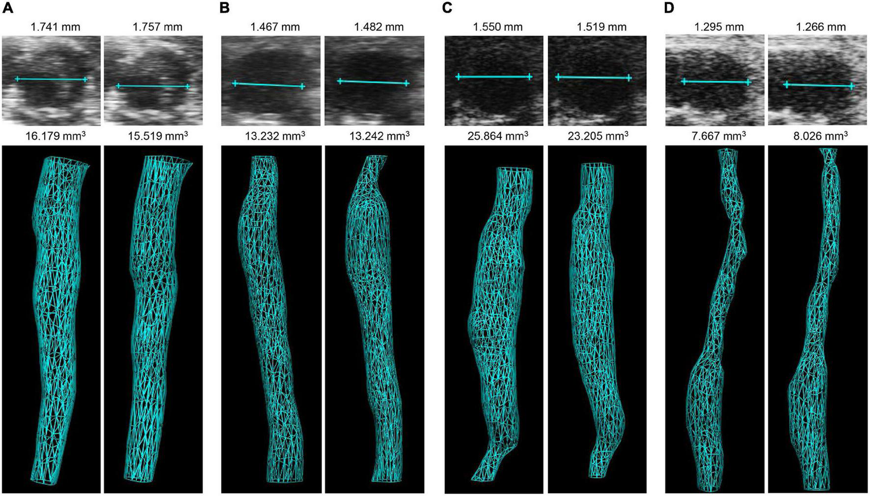 Illustration of 3D volume and maximum aortic diameter measurements in four AAA mouse models by two independent observers. Examples are given for diameter (upper panel) and 3D reconstructed volume (lower panel) in the (A) AngII model, (B) ePPE model, (C) ePPE + BAPN model, (D) PPE model, as assessed by observer 1 (left) and observer 2 (right). Of note, 3D vascular images represent inner lumen. In case of the AngII model thrombi were included in the aortic wall tracing.