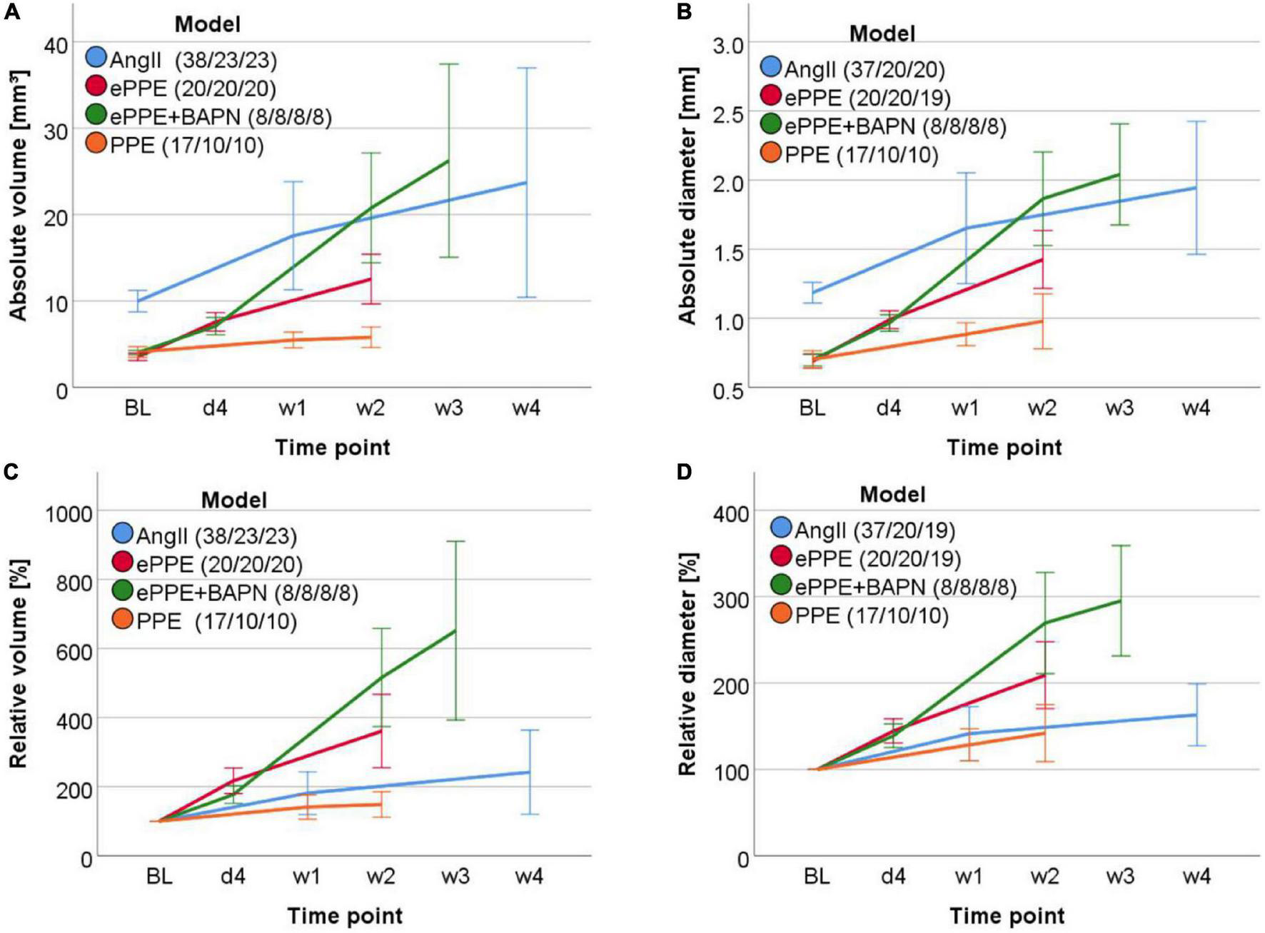 Abdominal aortic aneurysms were induced in 38, 20, 8, and 17 mice based on the AngII, ePPE, ePPE + BAPN, or PPE experimental procedures (Figure 1D). While no animals were lost in the ePPE and the ePPE + BAPN groups, 15 mice (39%) experienced aortic ruptures within the first 10 days of AngII treatment and 7 mice were lost to postoperative paralysis (41%) after PPE perfusion. Hence, data from 23 AngII, 20 ePPE, 8 ePPE + BAPN, and 10 PPE mice were included in the follow-up time points. 3D US investigation was conducted at baseline, early and advanced stages of AAA development resulting in data sets of 84, 60, 32, and 37 aortic volume measurements for the AngII, ePPE, ePPE + BAPN, and PPE models. Of note, maximum diameter was additionally recorded for 77, 58, 32, and 37 data sets, respectively.