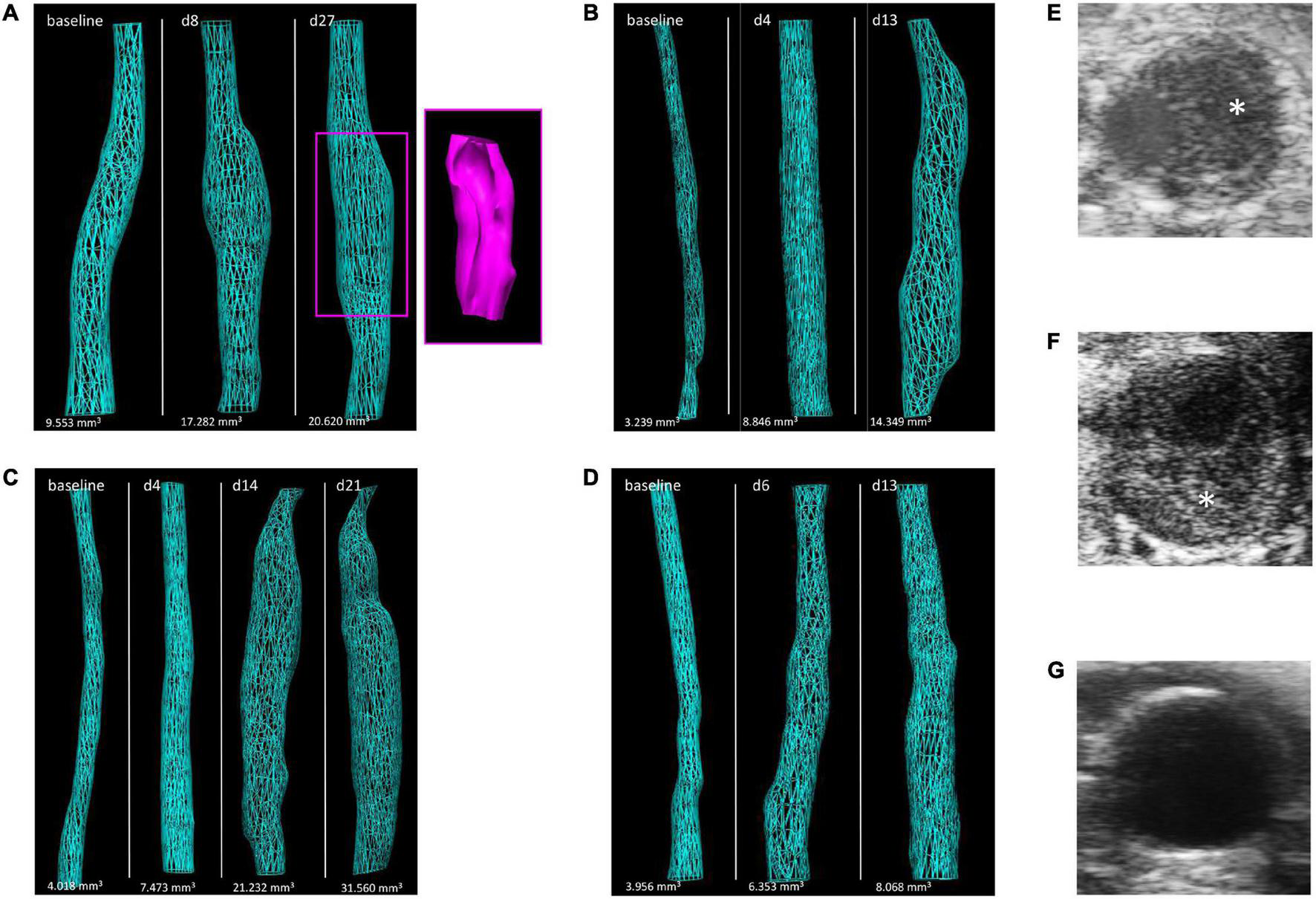 Illustration of morphological changes by 3D US over the time course of aneurysm development in the four AAA mouse models. Images of 3D reconstructed abdominal aorta regions are shown for representative mice of the (A) AngII model (including a 3D reconstructed thrombus in pink), (B) ePPE model, (C) ePPE + BAPN model, and (D) PPE model. Examples of aorta cross-sections in the AngII model are given for (E,F) AAAs with intramural thrombus (asterisk) or (G) without thrombus.