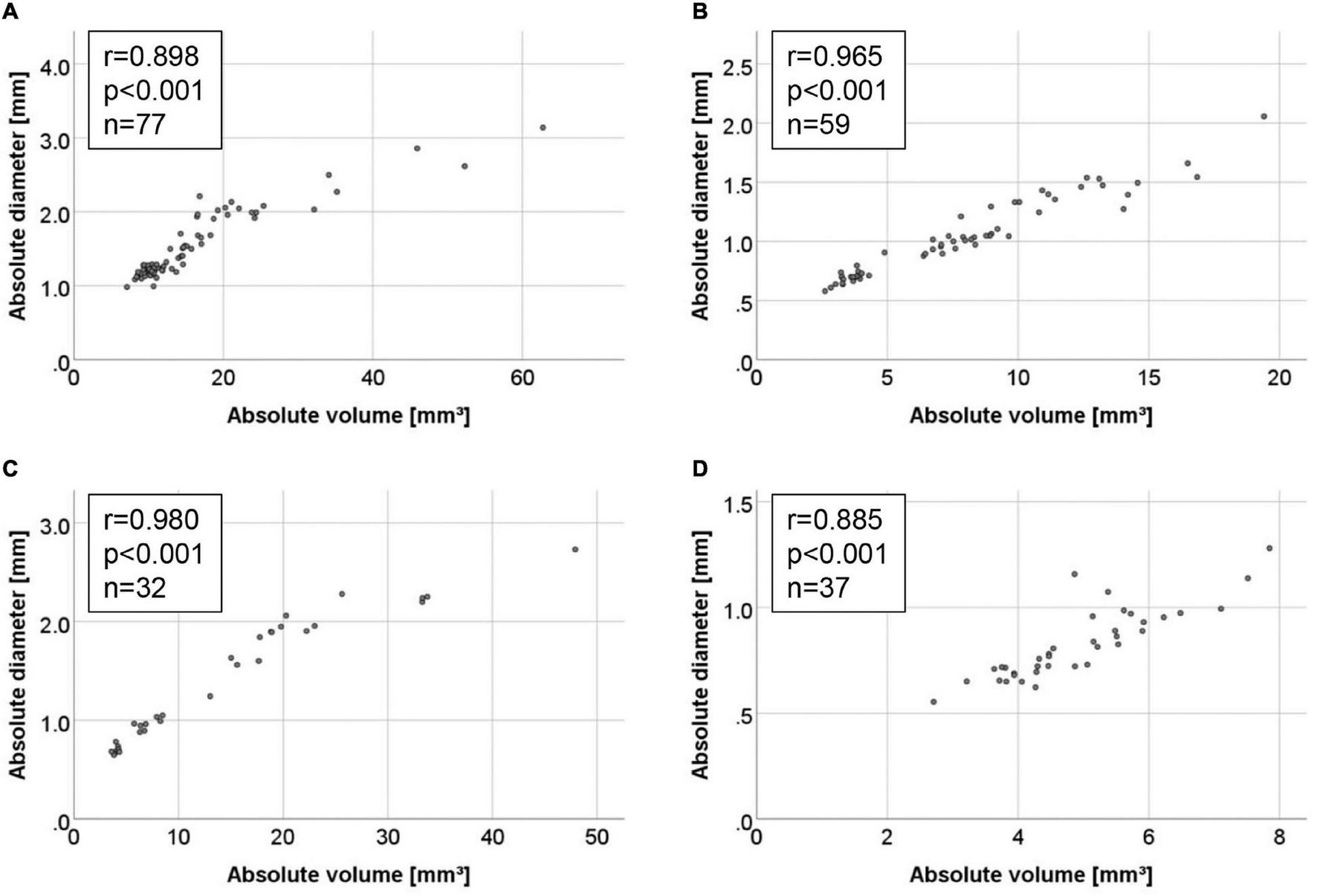 Correlation between volume and diameter measurements was depicted by scatter plots and Spearman coefficient. To compare aortic volume and maximum diameter in detecting aneurysm growth at early time points, Cohen’s standardized effect size was determined for the distinction between aortic size at baseline vs. first time point of AAA detection for all parameters and models.