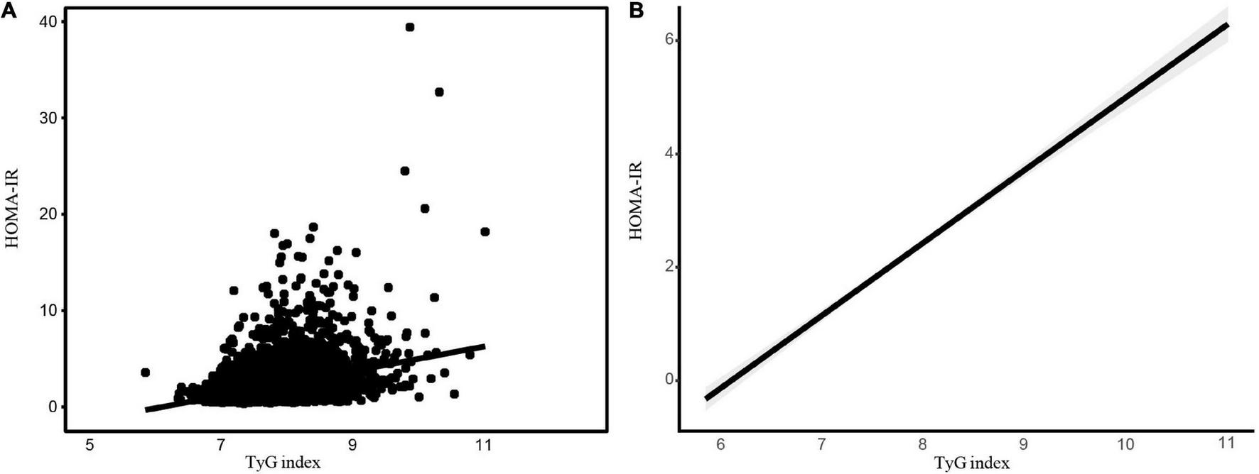 The association between the TyG index and HOMA-IR. The association between the TyG index and HOMA-IR. (A) Each black point represents a sample. (B) A solid black line represents the smooth curve fit between variables. The gray area represents the 95% of confidence interval (CI) from the fit. Abbreviations: TyG, Triglyceride-glucose; HOMA-IR, homeostasis model assessment-insulin resistance.