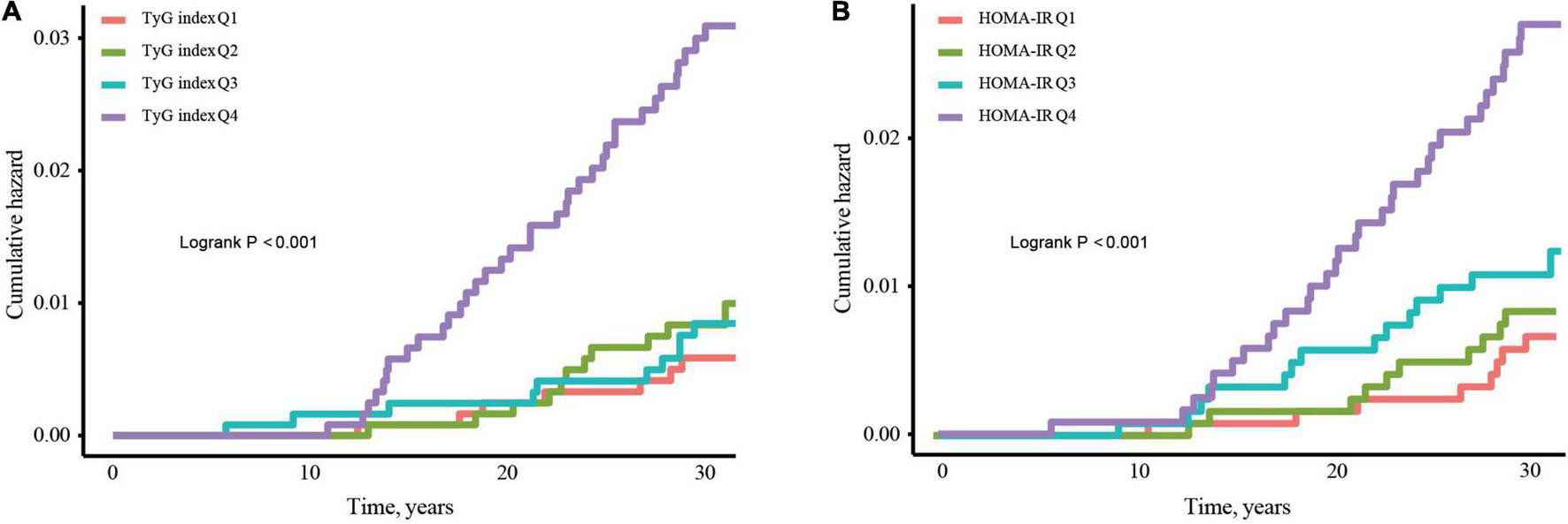 On completing risk analysis, the cumulative CHF incidence among the TyG index and HOMA-IR quartile are illustrated in Figure 2. Participants in the quartile of the TyG index Q4 were at an increased risk of CHF events in comparison to the Q1 group throughout the clinical monitoring timeframe (log-rank test, p < 0.001; Figure 2A). Similar results were observed for HOMA-IR (Figure 2B).