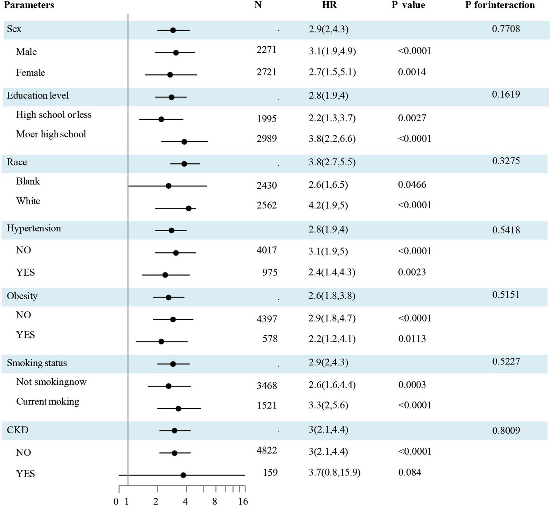 The association of CHF and the TyG index by a subgroup analysis. The association of CHF and the TyG index by a sub-group analysis. Data are hazard ratios (HRs) and 95% confidence limits (95% CLs). The participants were divided into subgroups according to sex, race, education, obesity, smoking status, hypertension, and CKD. The results were evaluated after adjusted for age, sex, race, education, obesity, smoking status, hypertension, diabetes mellitus, hypercholesteremia, CKD, LDL-C, and HDL-C except for the sub-group variable. Abbreviations: HDL-C, high-density lipoprotein cholesterol; LDL-C, low-density lipoprotein cholesterol; TyG, Triglyceride-glucose; CKD, chronic kidney diseases; HOMA-IR, homeostasis model assessment-insulin resistance; CHF, congestive heart failure.