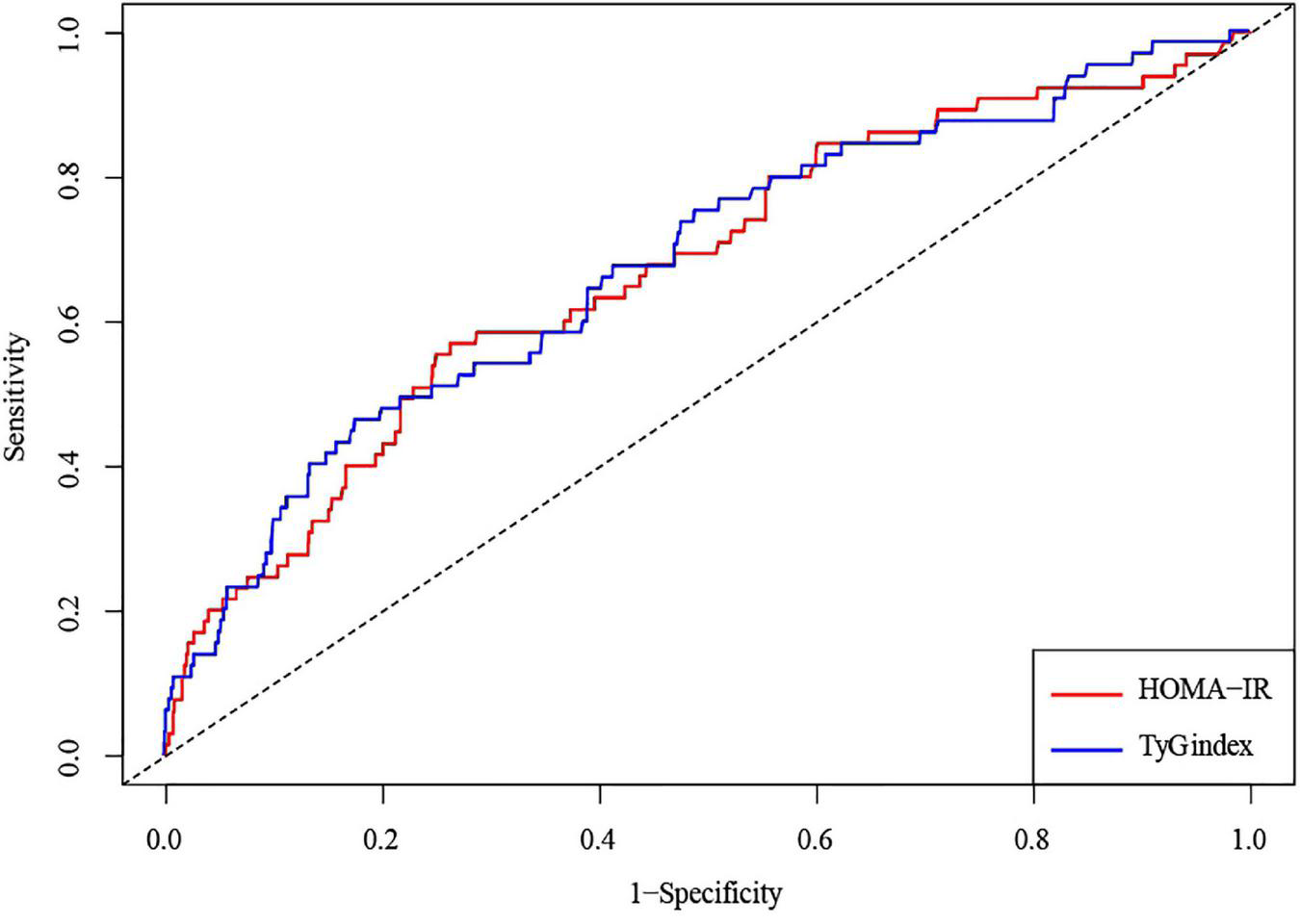 The area under the curve (AUC) of the TyG index and HOMA-IR to predict CHF incidence.