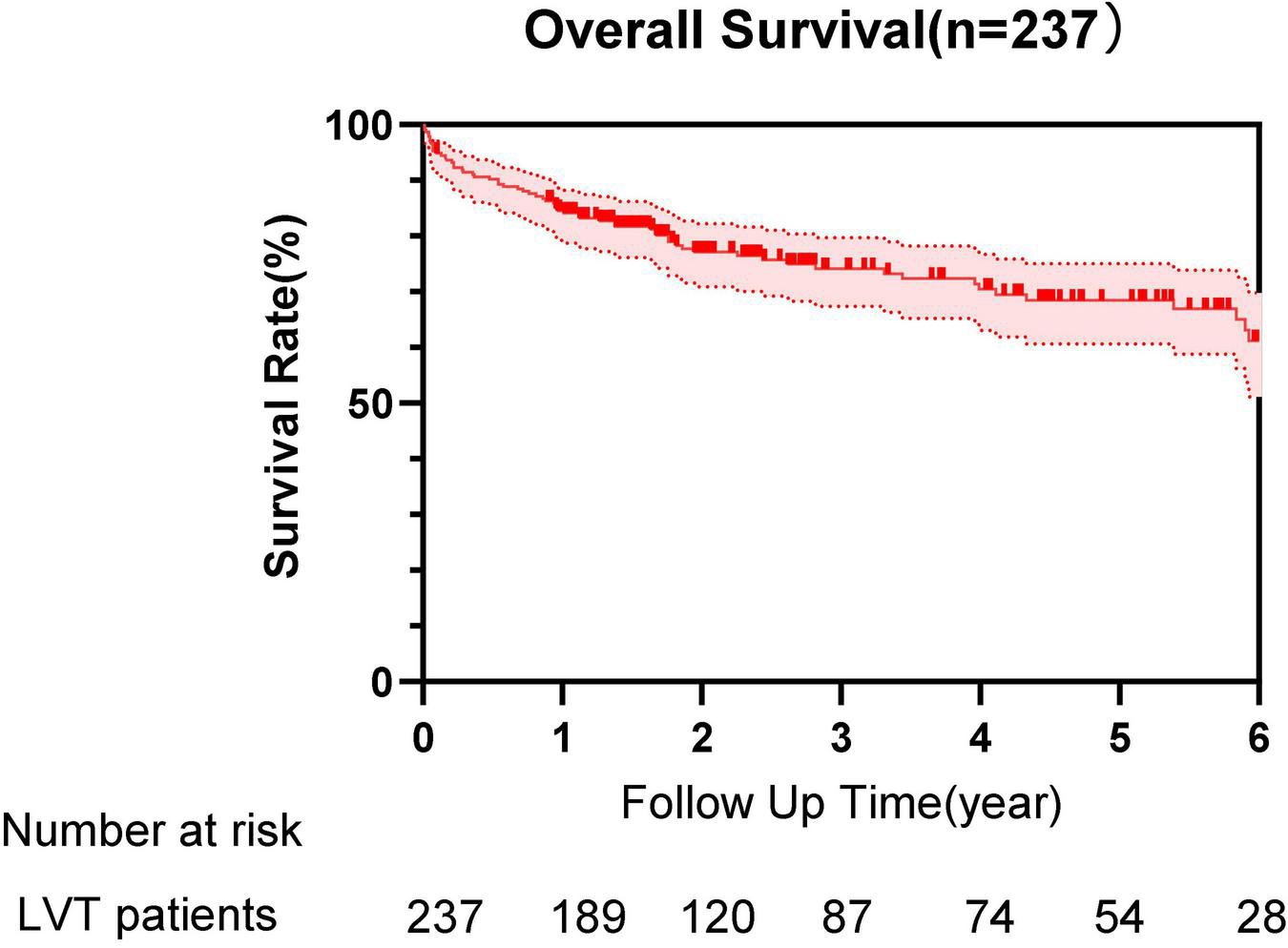 Within a median follow-up period of 736 days, the rate of MACE occurred in 36.7% (n = 87): all-cause mortality 28.3%, ischemic stroke 8.4%, MI 3%, and peripheral artery emboli 1.7%. Of all-cause mortality, 61 cases (91%) were cardiovascular deaths and 6 patients (9%) died of non-cardiovascular origin, including pneumonia, cancers, bleeding, and multiple injuries. The median duration from diagnosis of LVT to death was 318 days. All emboli complications included 20 cases with stroke, 7 cases with MI, and 4 cases with peripheral artery emboli. Bleeding events of varying degrees occurred in 16.9% (n = 40) patients: TIMI I bleeding 4.2% (n = 10), TIMI II bleeding 3.4% (n = 8), and TIMI III bleeding 9.3% (n = 22) of patients, respectively. Bleeding events included 6 cases of cerebral hemorrhage, 14 cases of the gastrointestinal tract, 2 cases of hemoptysis, 2 cases of the urinary system, 1 case of the abdominal cavity, 2 cases of postoperative wound bleeding, and 17 cases of skin and mucous membranes (4 of them had bleeding in 2 sites). In addition, we also collected the following clinical outcomes during the period of observation: 5 cases had heart transplantation, 1 case underwent ventricular tumor resection, 1 case underwent ventricular aneurysm closure, 2 patients had a new left atrial thrombus, 4 cases had venous emboli, and 20 patients were observed to have recurrent LVT.