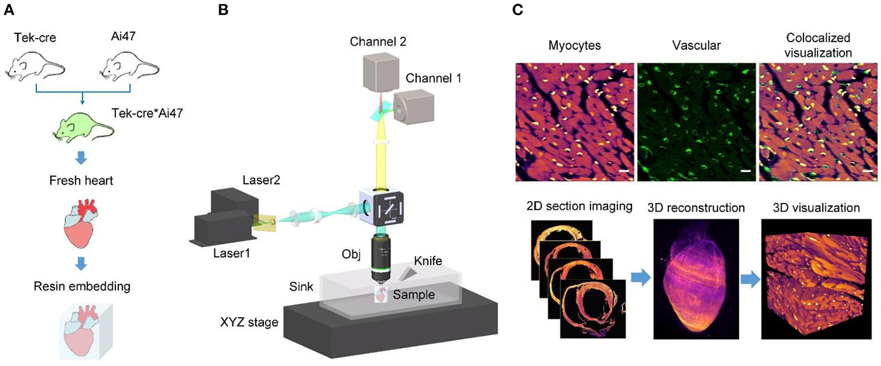 Single-cell-level heart-wide data acquisition pipeline. (A) Whole-heart sample preparation. We produced vascular fluorescent-labeled transgenic mice (Tek-cre*Ai47) by crossing two transgenic mice (Tek-cre and Ai47), obtained their fresh heart tissues, and embedded them into HM20, a stiff resin. (B) System setup of HD-dfMOST. The system is composed of a line-illumination modulation (LiMo) microscope and a microtome. (Obj, objective lens; sCMOS, scientific complementary metal oxide semiconductors). (C) Cardiac fMOST data were processed and are shown in 2D and 3D.
